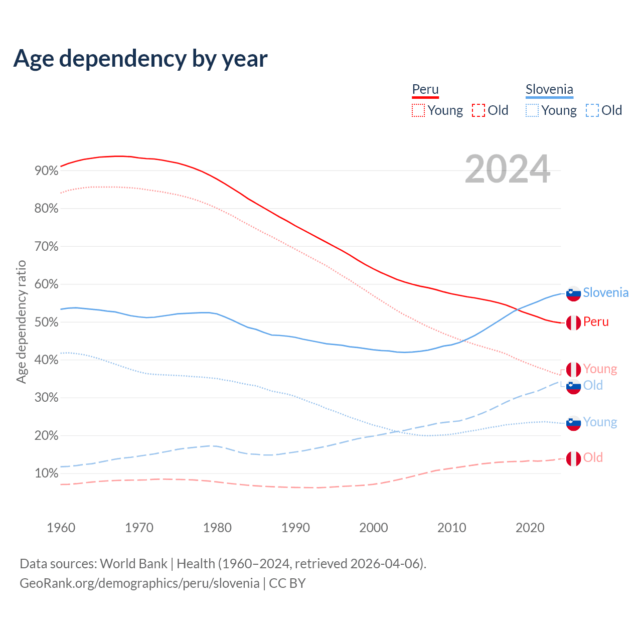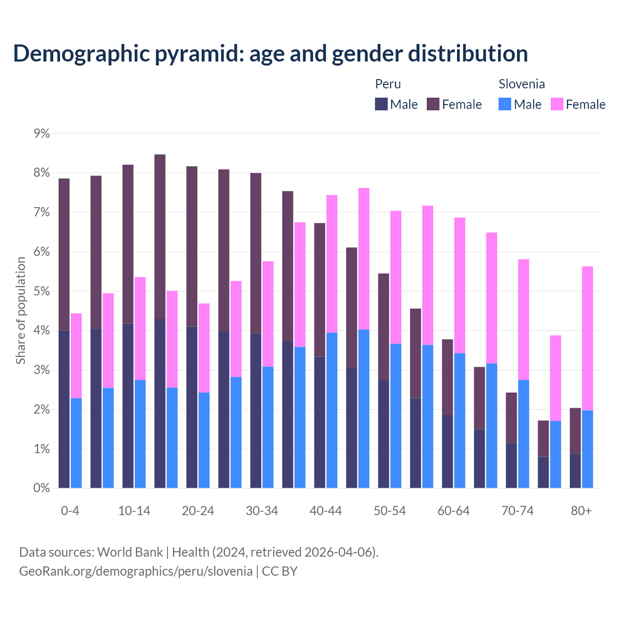 - Peru is ranked 97/196 by median age (oldest to youngest) vs 14/196 for Slovenia.