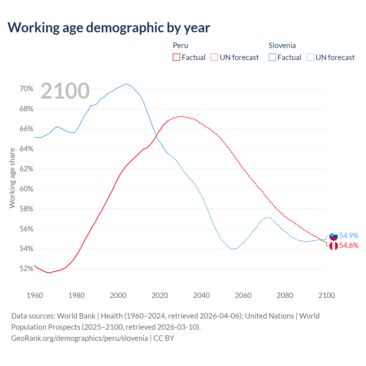 - Peru has 23.4M working age adults (aged 15-64) vs 1.35M in Slovenia.