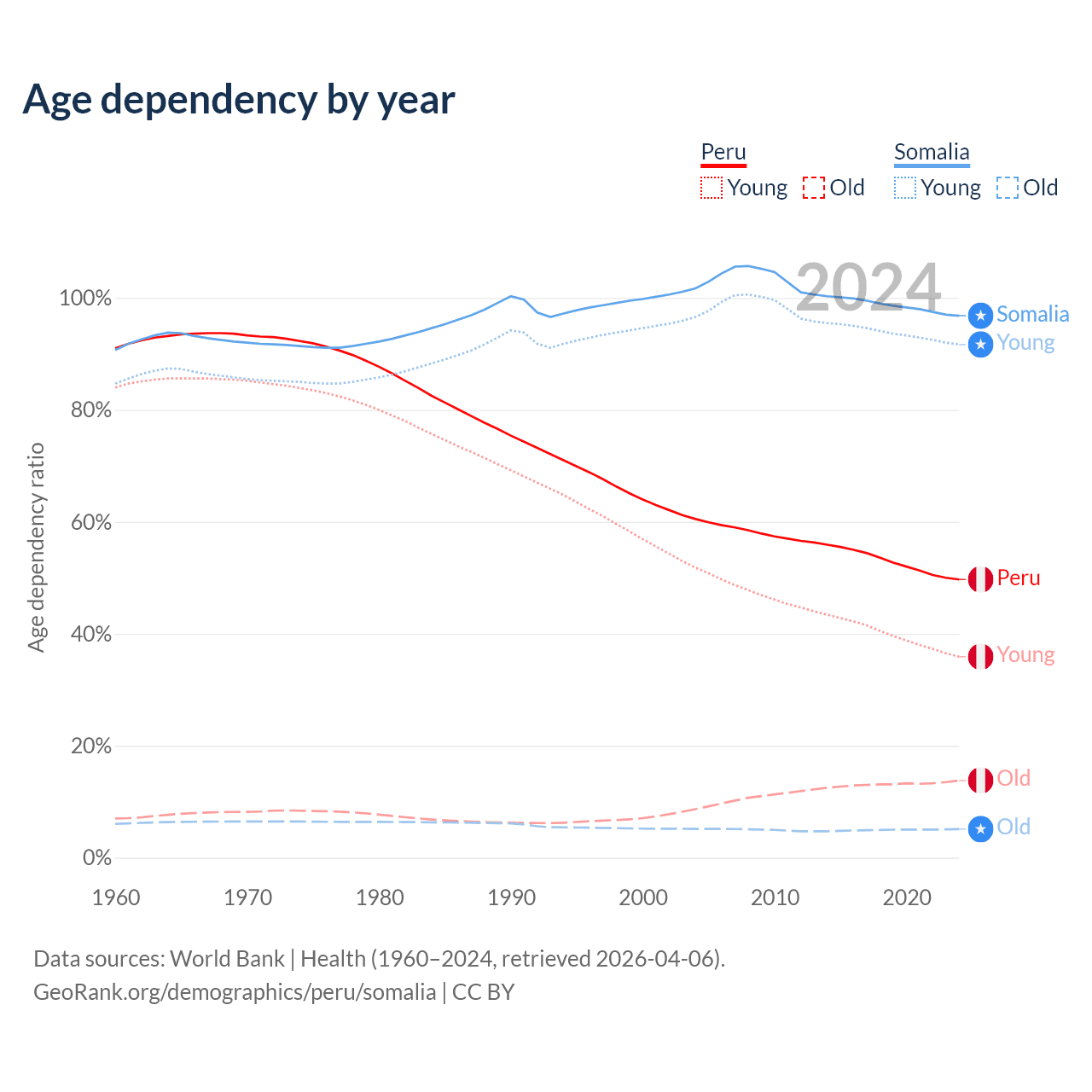 - Peru is ranked 97/196 by median age (oldest to youngest) vs 194/196 for Somalia.