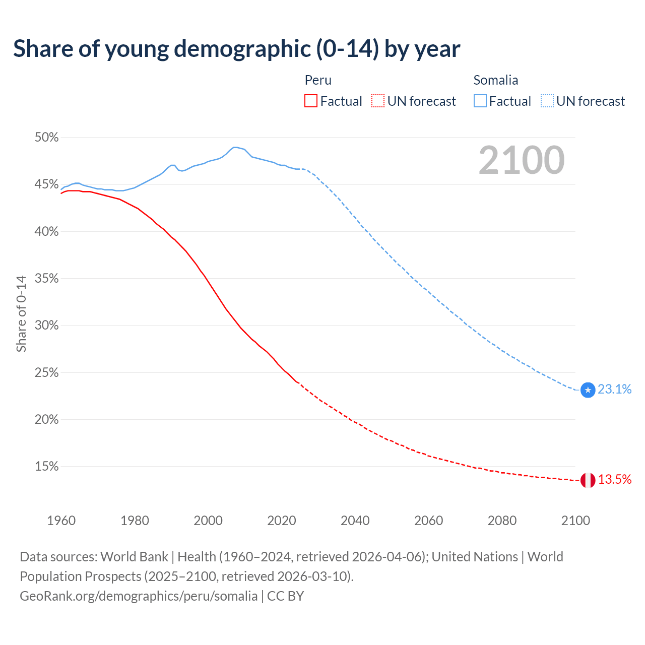 - The share of young demographic (0-15 years old) in Peru is 24% vs 46.6% in Somalia.