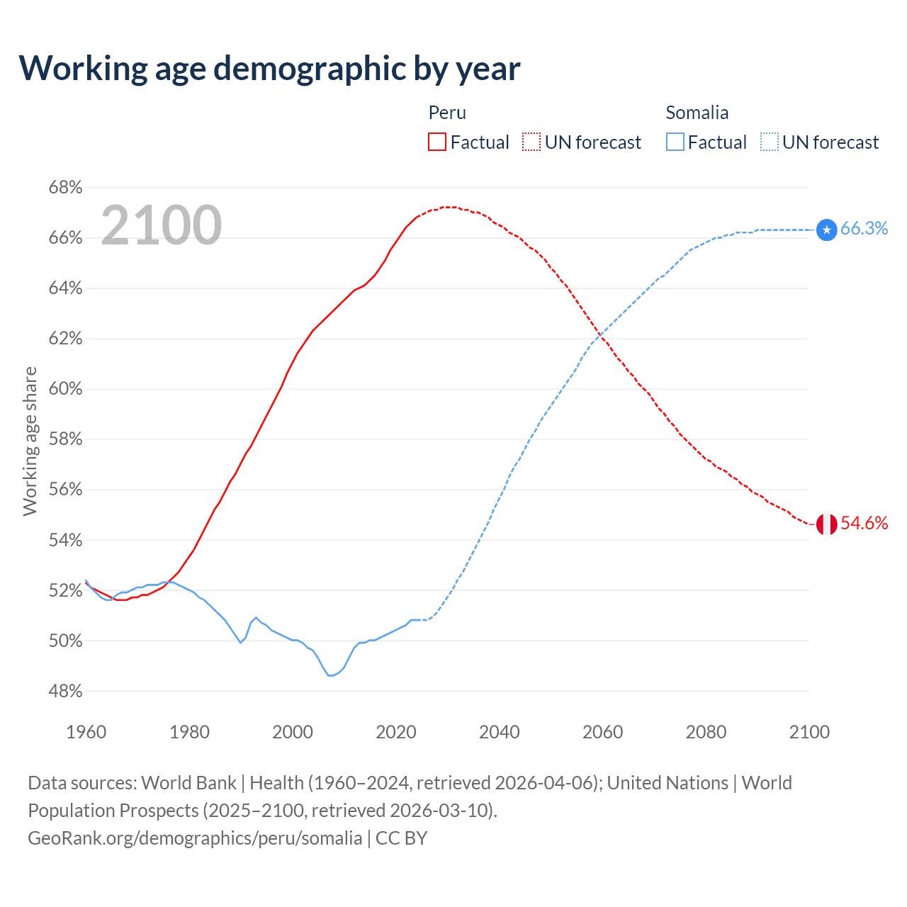 - Peru has 23.4M working age adults (aged 15-64) vs 10.4M in Somalia.