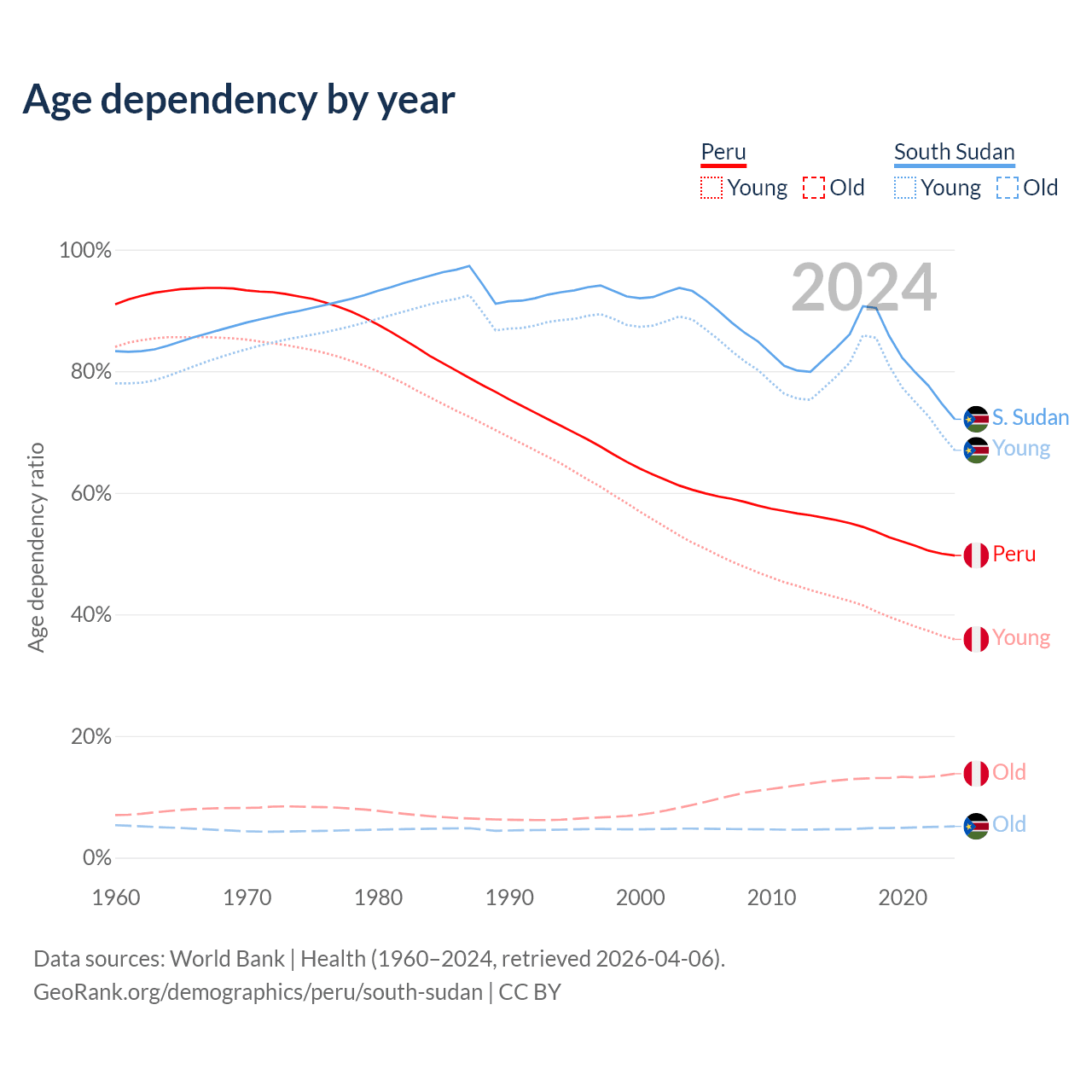 - Peru is ranked 97/196 by median age (oldest to youngest) vs 173/196 for South Sudan.
