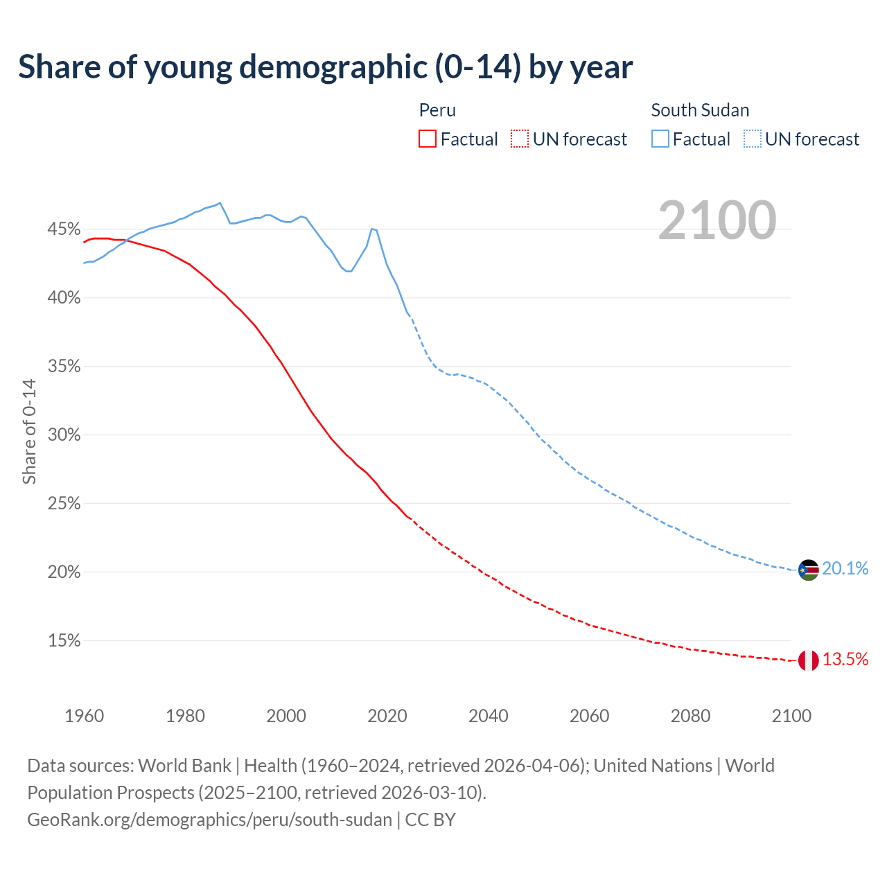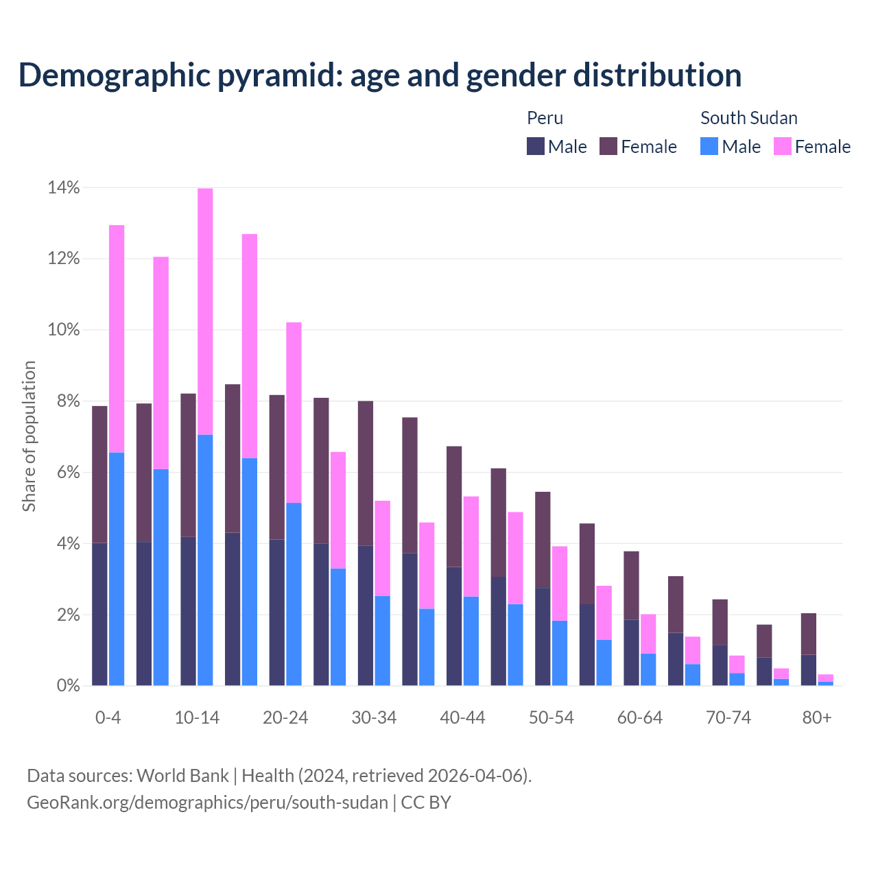 - As of 2026, the population of Peru is 35M vs 12.5M in South Sudan - 2.8 times difference.