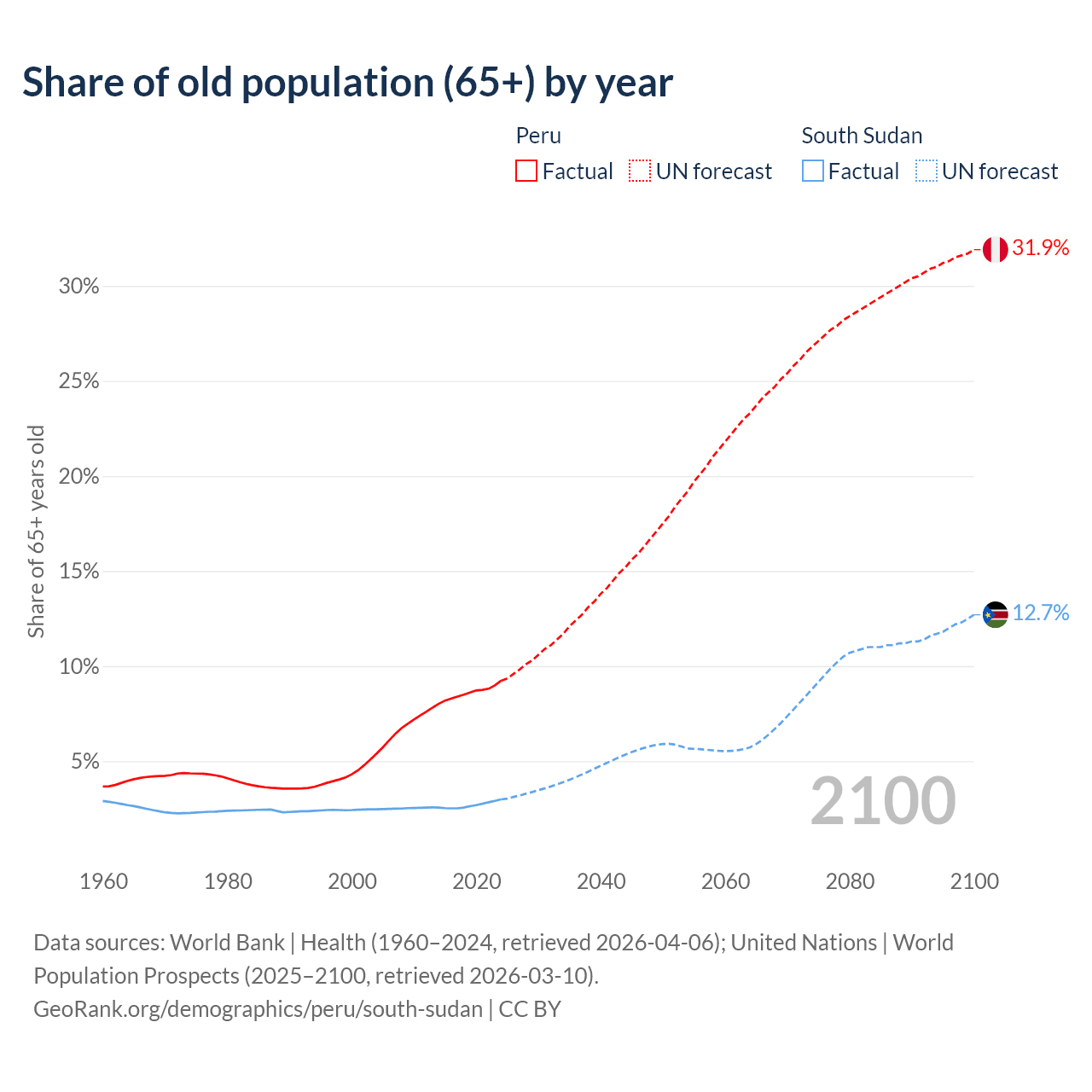 The share of older people aged 65 and over is 9.23% in Peru and 2.99% in South Sudan. Life expectancy in Peru compared to South Sudan .