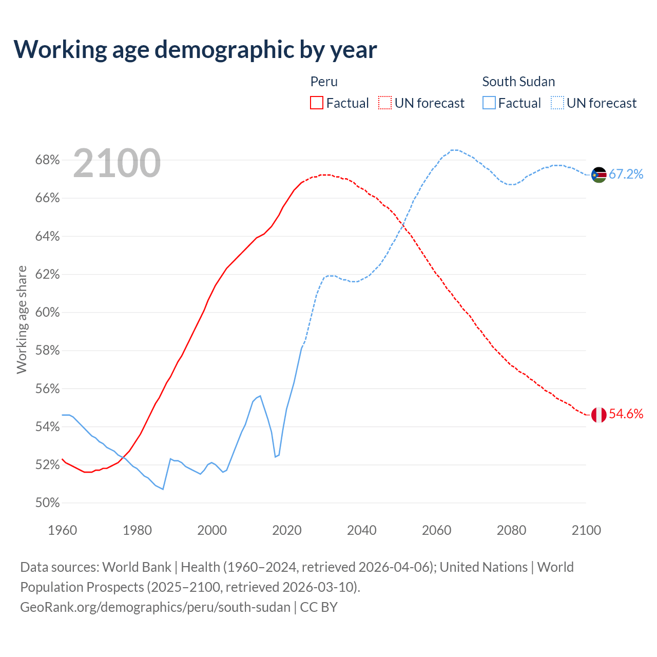 - Peru has 23.4M working age adults (aged 15-64) vs 7.27M in South Sudan.