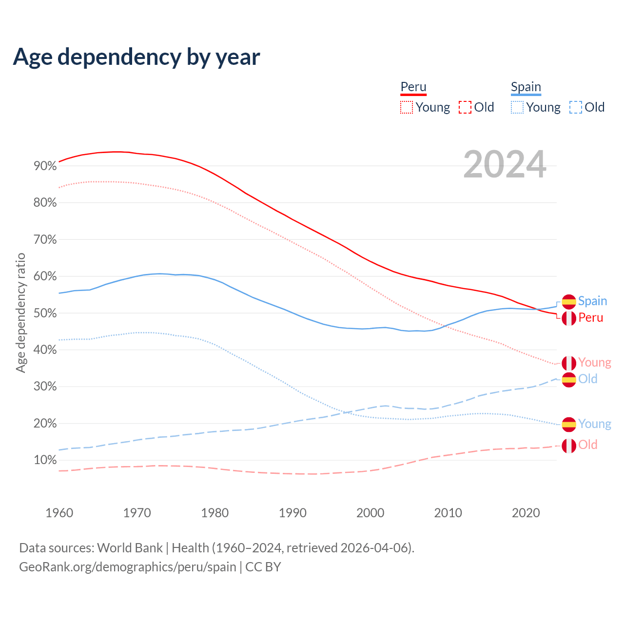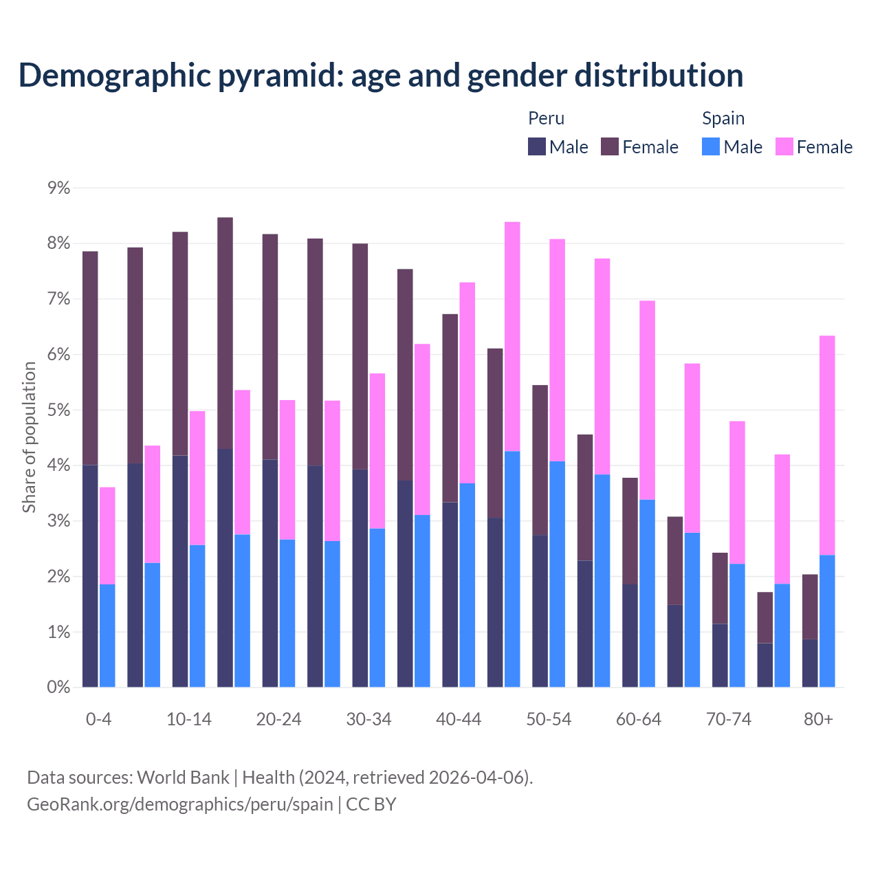 - Peru is ranked 97/196 by median age (oldest to youngest) vs 7/196 for Spain.