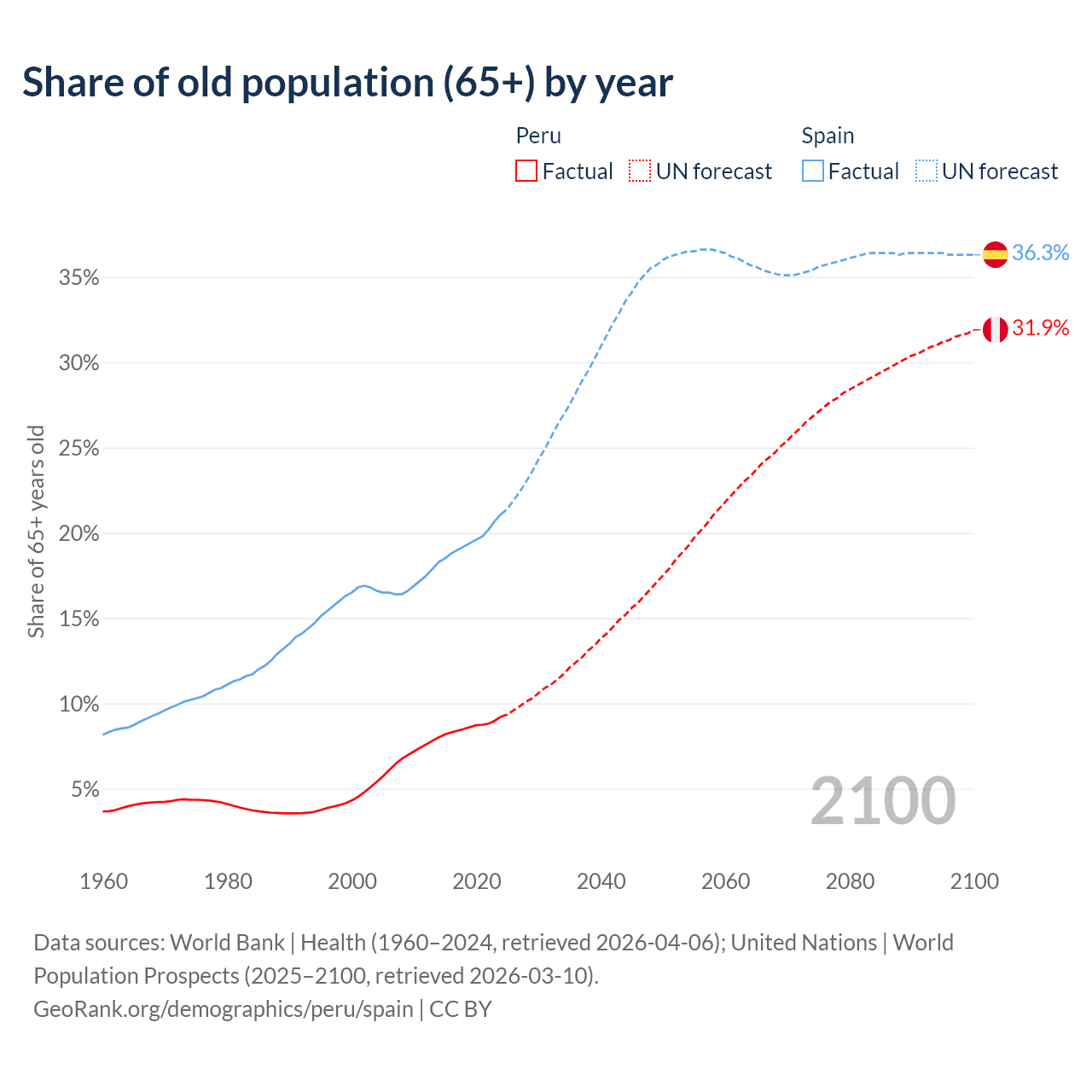 The share of older people aged 65 and over is 9.23% in Peru and 21.1% in Spain. Life expectancy in Peru compared to Spain .