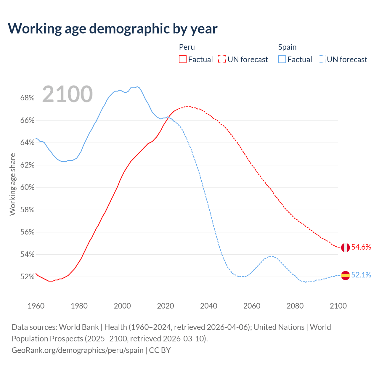 Median age Peru vs Spain, 1960-2100