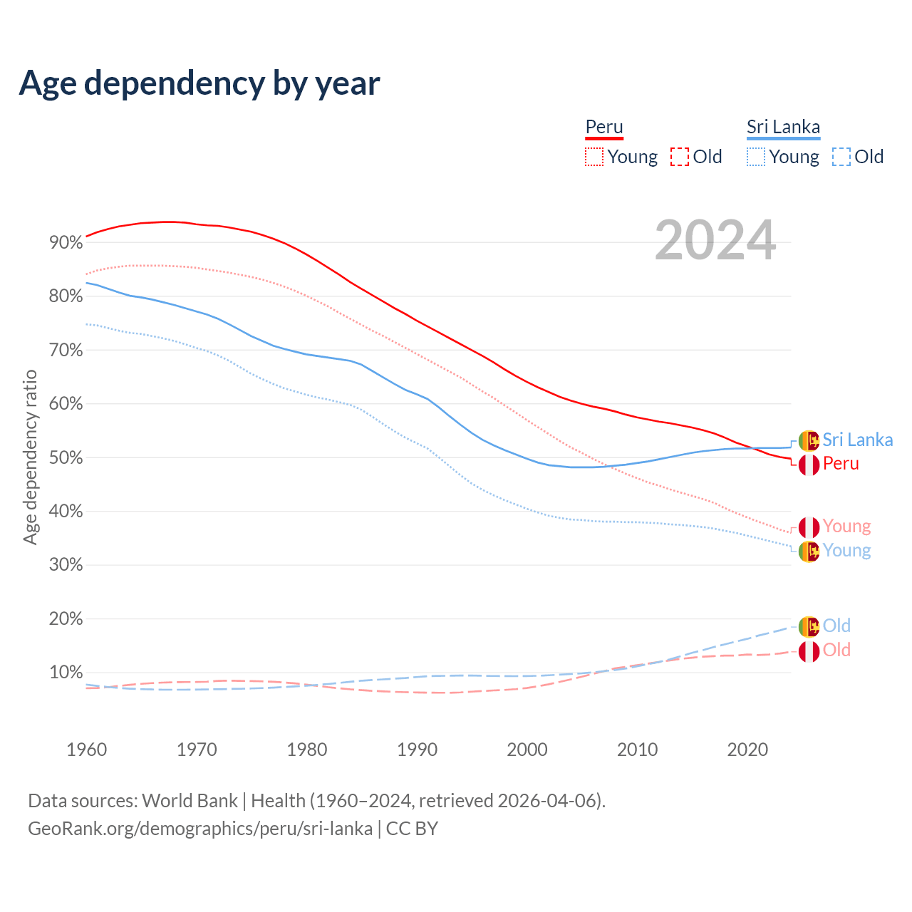- Peru is ranked 97/196 by median age (oldest to youngest) vs 81/196 for Sri Lanka.