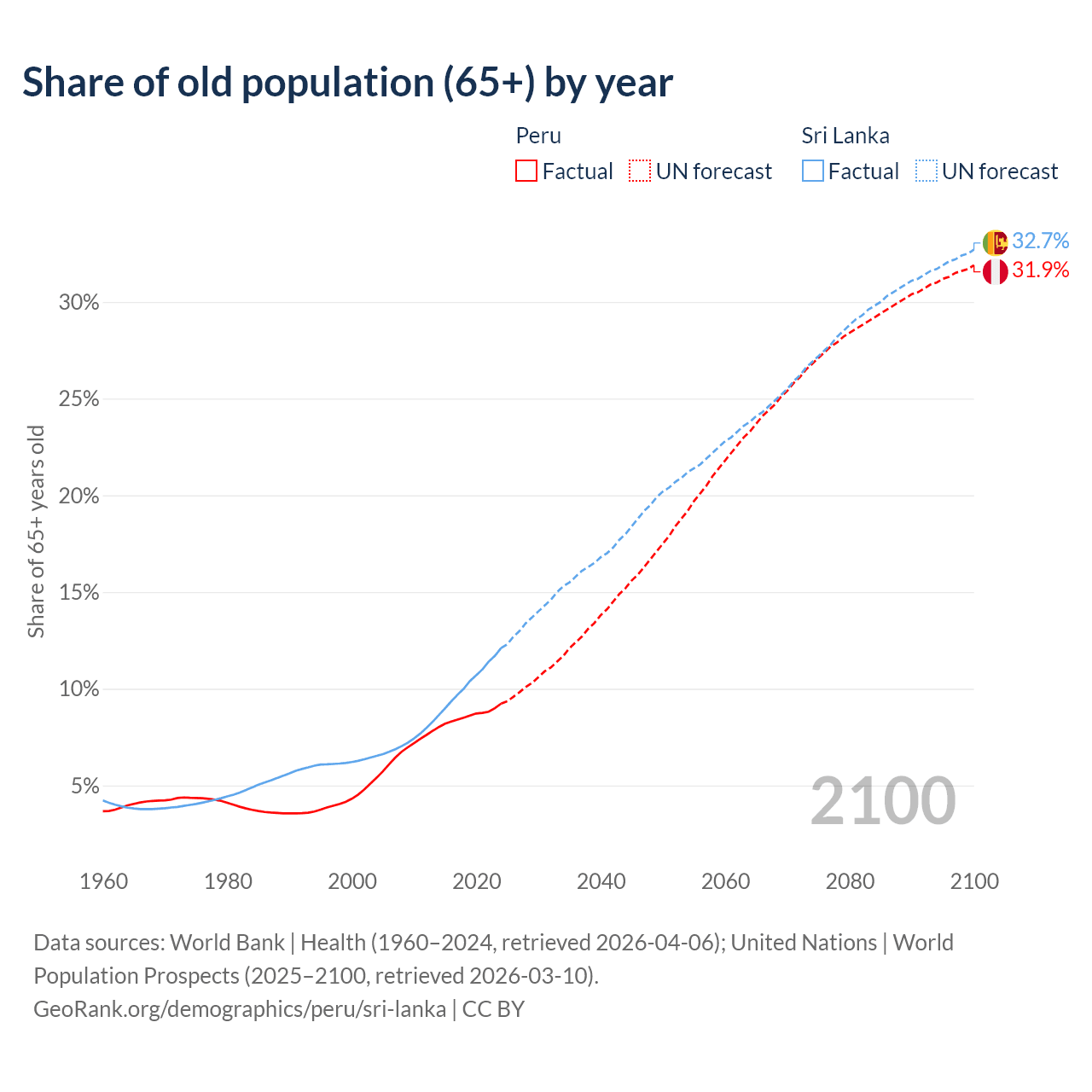 The share of older people aged 65 and over is 9.23% in Peru and 12.1% in Sri Lanka. Life expectancy in Peru compared to Sri Lanka .