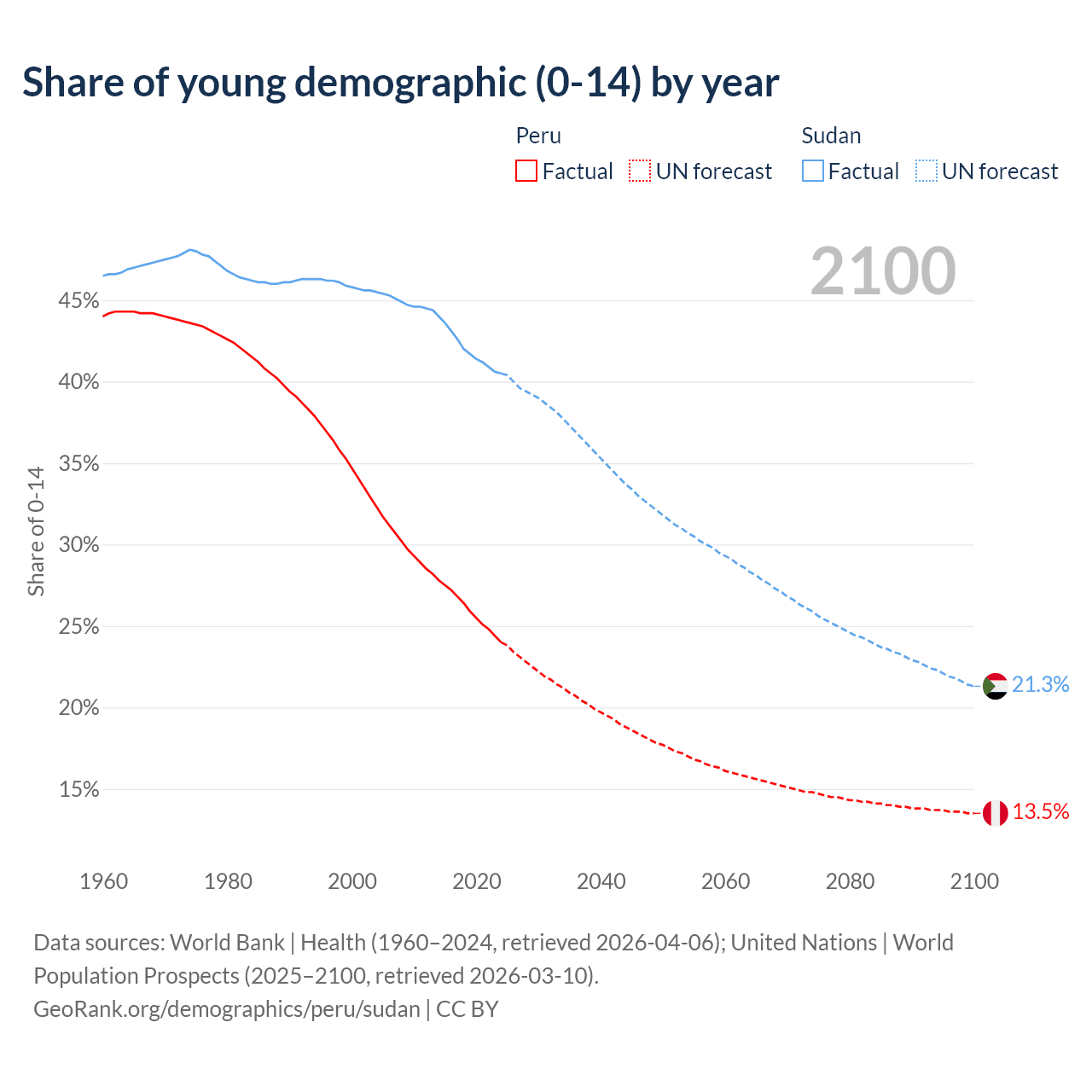 - The share of young demographic (0-15 years old) in Peru is 24% vs 40.5% in Sudan.