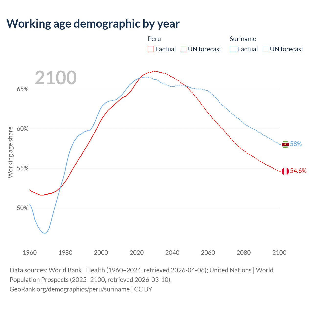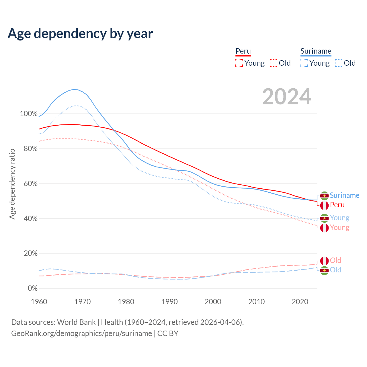 - Peru is ranked 97/196 by median age (oldest to youngest) vs 109/196 for Suriname.