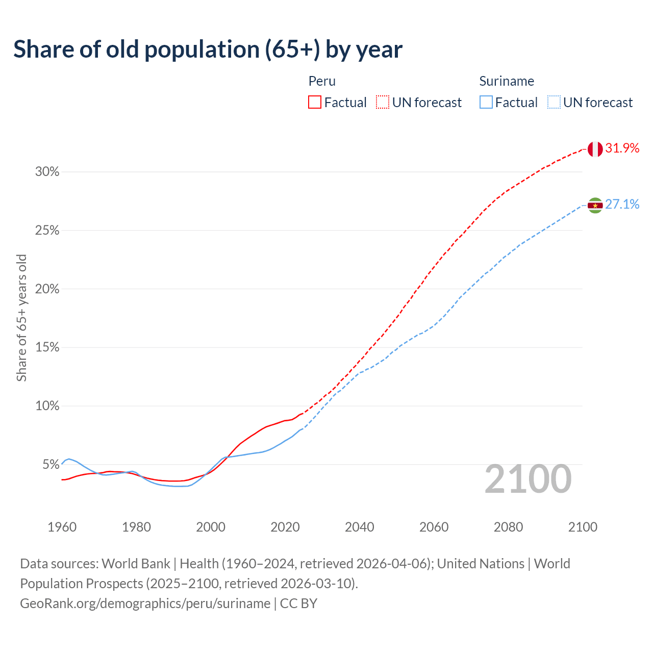 The share of older people aged 65 and over is 9.23% in Peru and 7.9% in Suriname. Life expectancy in Peru compared to Suriname .