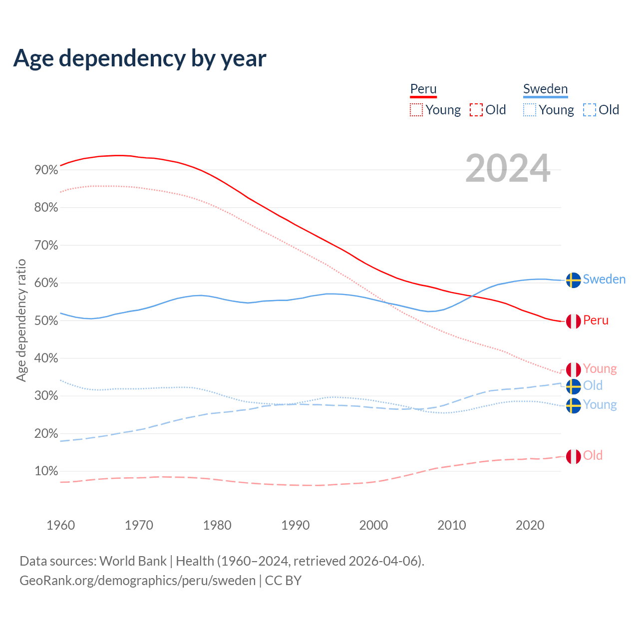 - Peru is ranked 97/196 by median age (oldest to youngest) vs 39/196 for Sweden.