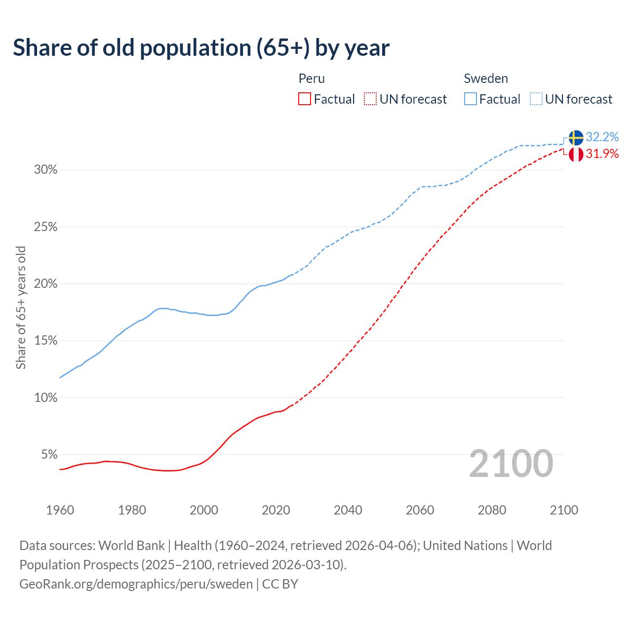 - The share of old-age demographic (65+) in Peru is 9.23% vs 20.7% in Sweden.