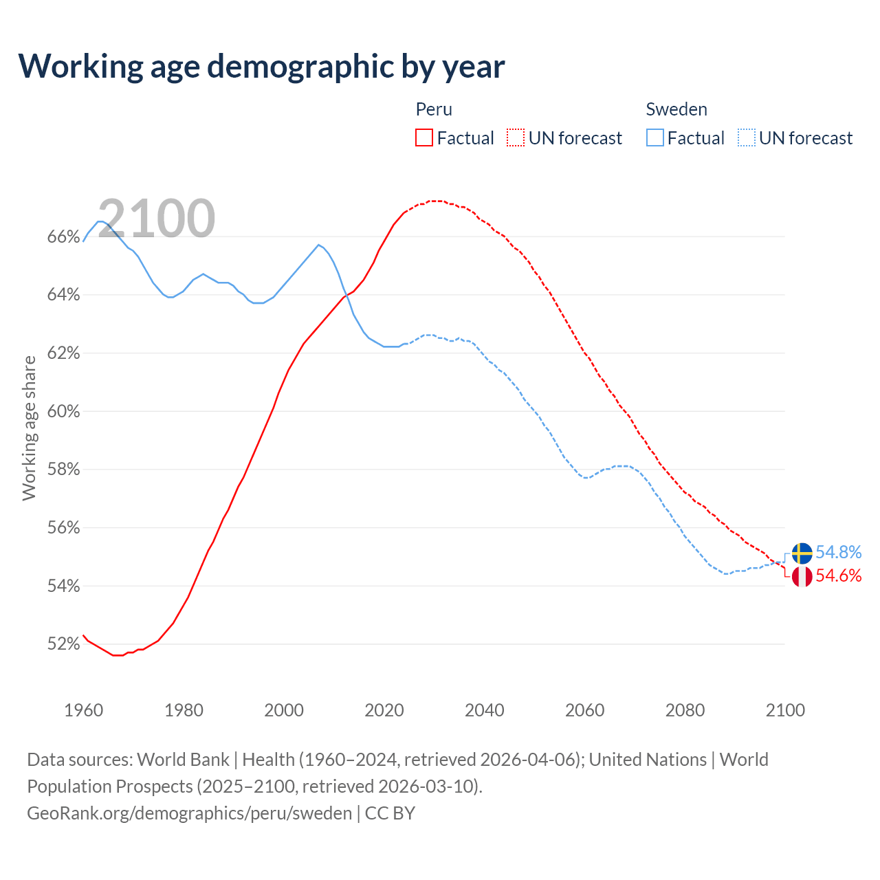 - Peru has 23.4M working age adults (aged 15-64) vs 6.65M in Sweden.