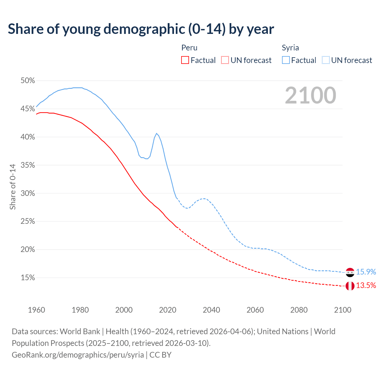 - The share of young demographic (0-15 years old) in Peru is 24% vs 29.2% in Syria.