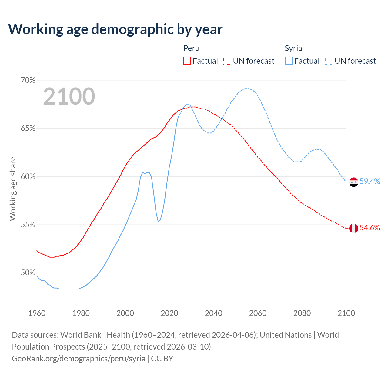 - Peru has 23.4M working age adults (aged 15-64) vs 17.7M in Syria.