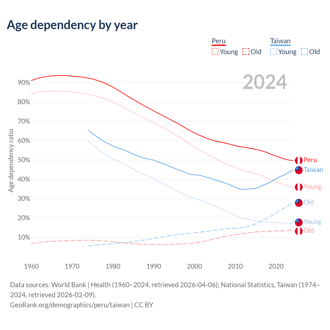 Data sources: World Bank | Health (1960–2024, retrieved 2026-04-06); U.S. Census Bureau (1960–2024, retrieved 2026-02-08); National Statistics, Taiwan (1974–2024, retrieved 2026-02-09).