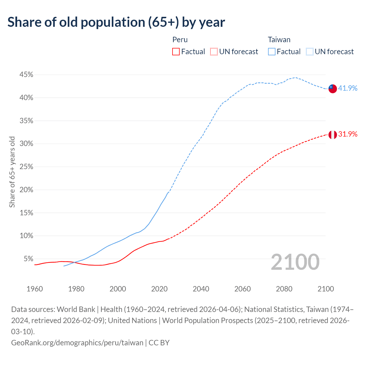 The share of older people aged 65 and over is 9.23% in Peru and 19.2% in Taiwan. Life expectancy in Peru compared to Taiwan .