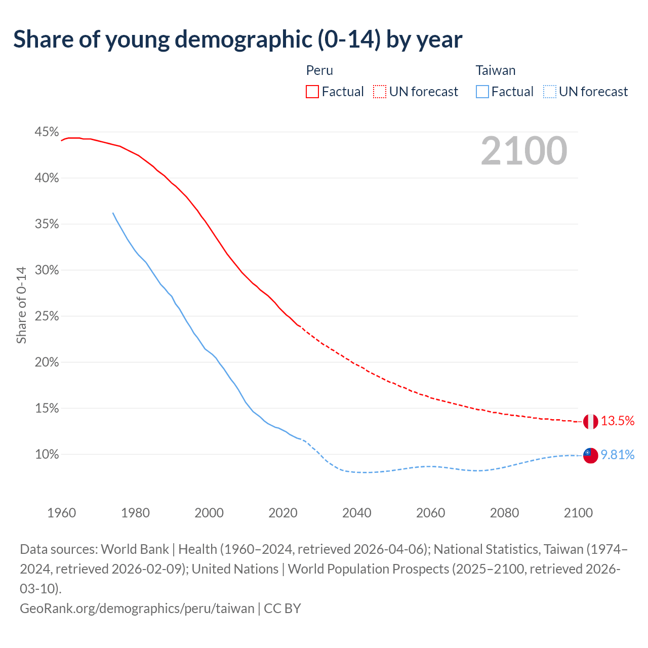 - The share of young demographic (0-15 years old) in Peru is 24% vs 11.7% in Taiwan.