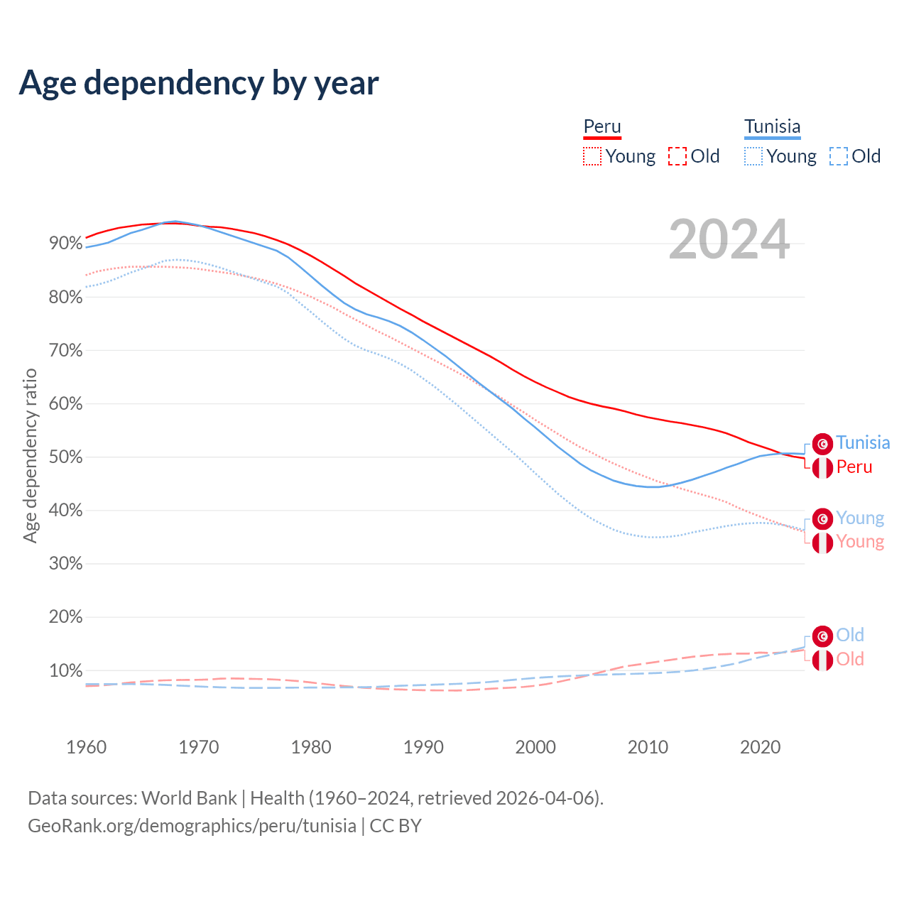 - Peru is ranked 97/196 by median age (oldest to youngest) vs 86/196 for Tunisia.