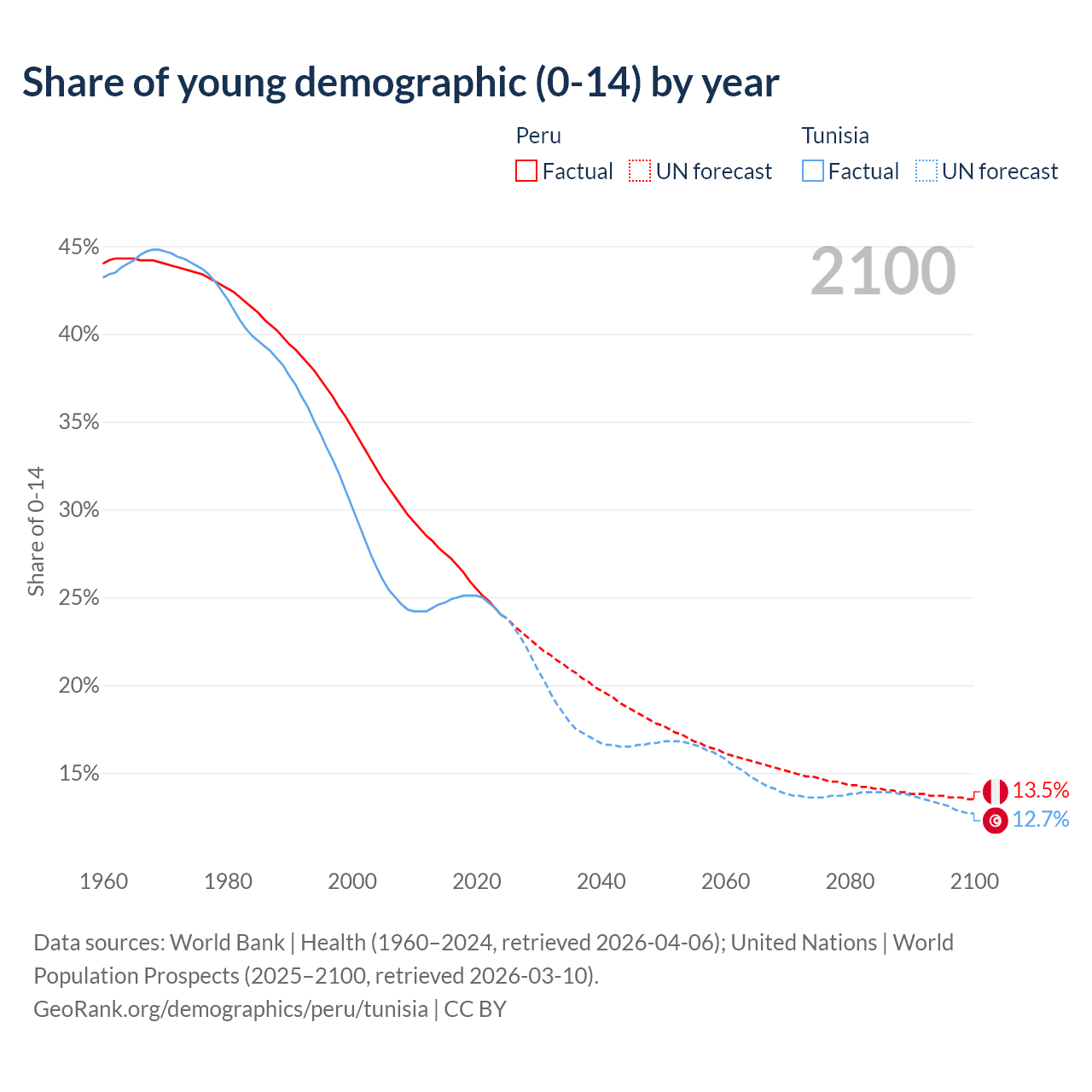 - The share of young demographic (0-15 years old) in Peru is 24% vs 24% in Tunisia.