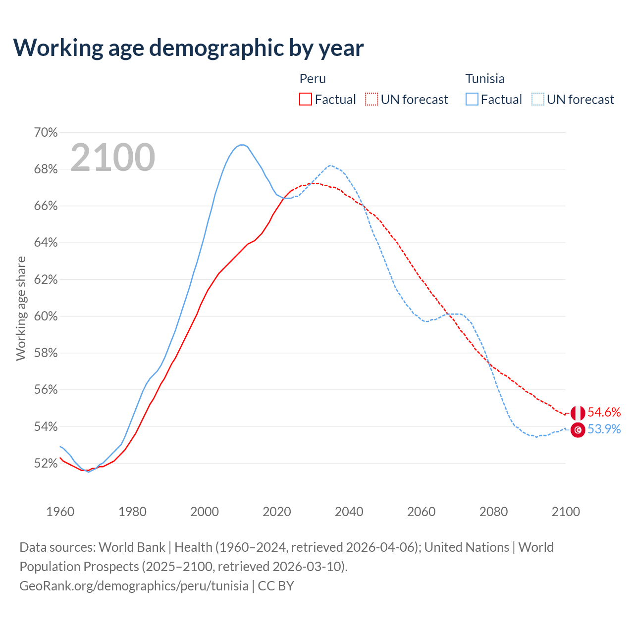 - Peru has 23.4M working age adults (aged 15-64) vs 8.26M in Tunisia.