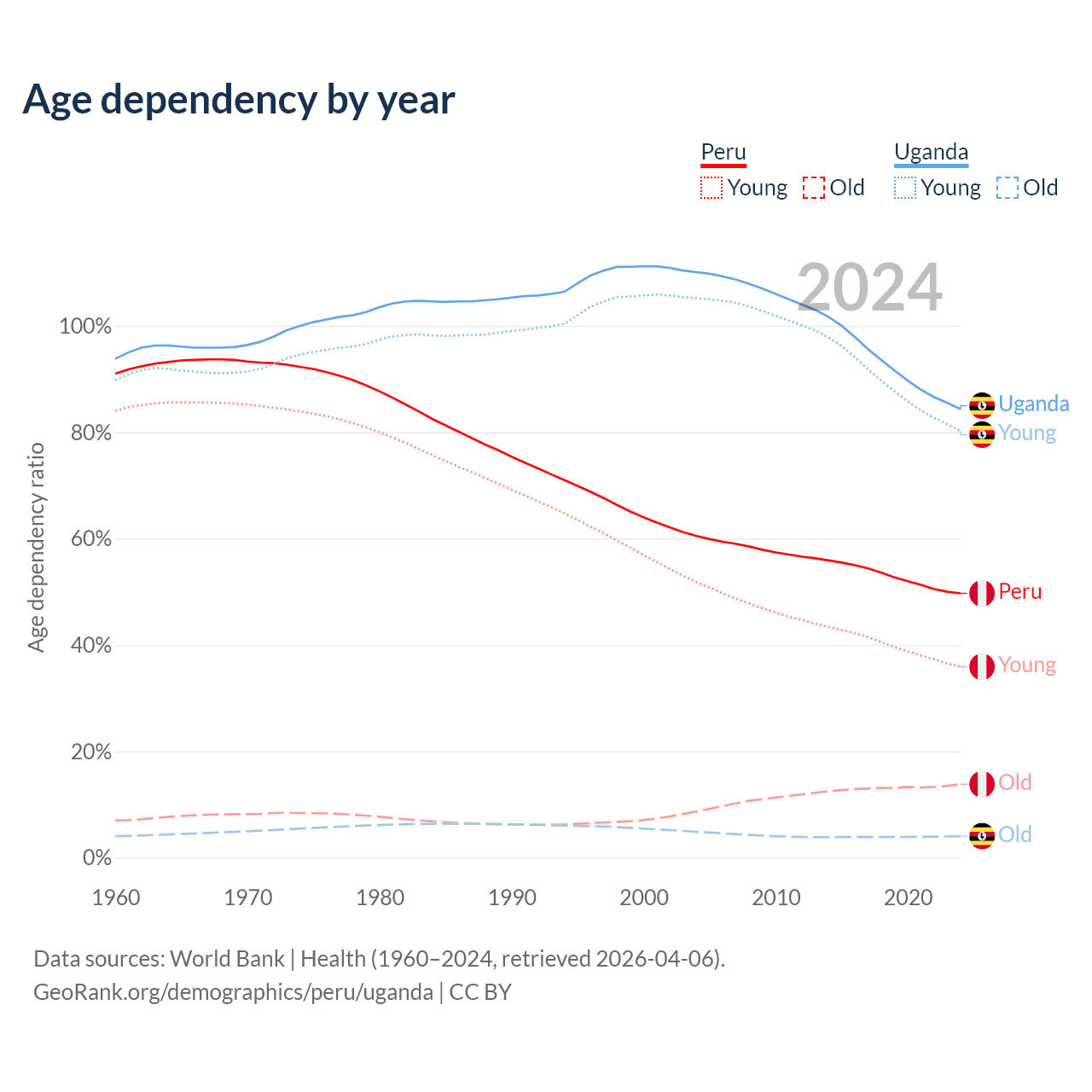 - Peru is ranked 97/196 by median age (oldest to youngest) vs 187/196 for Uganda.