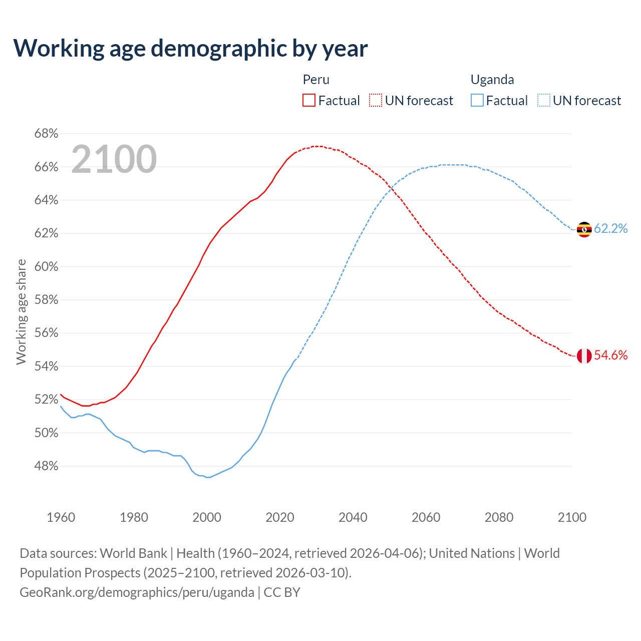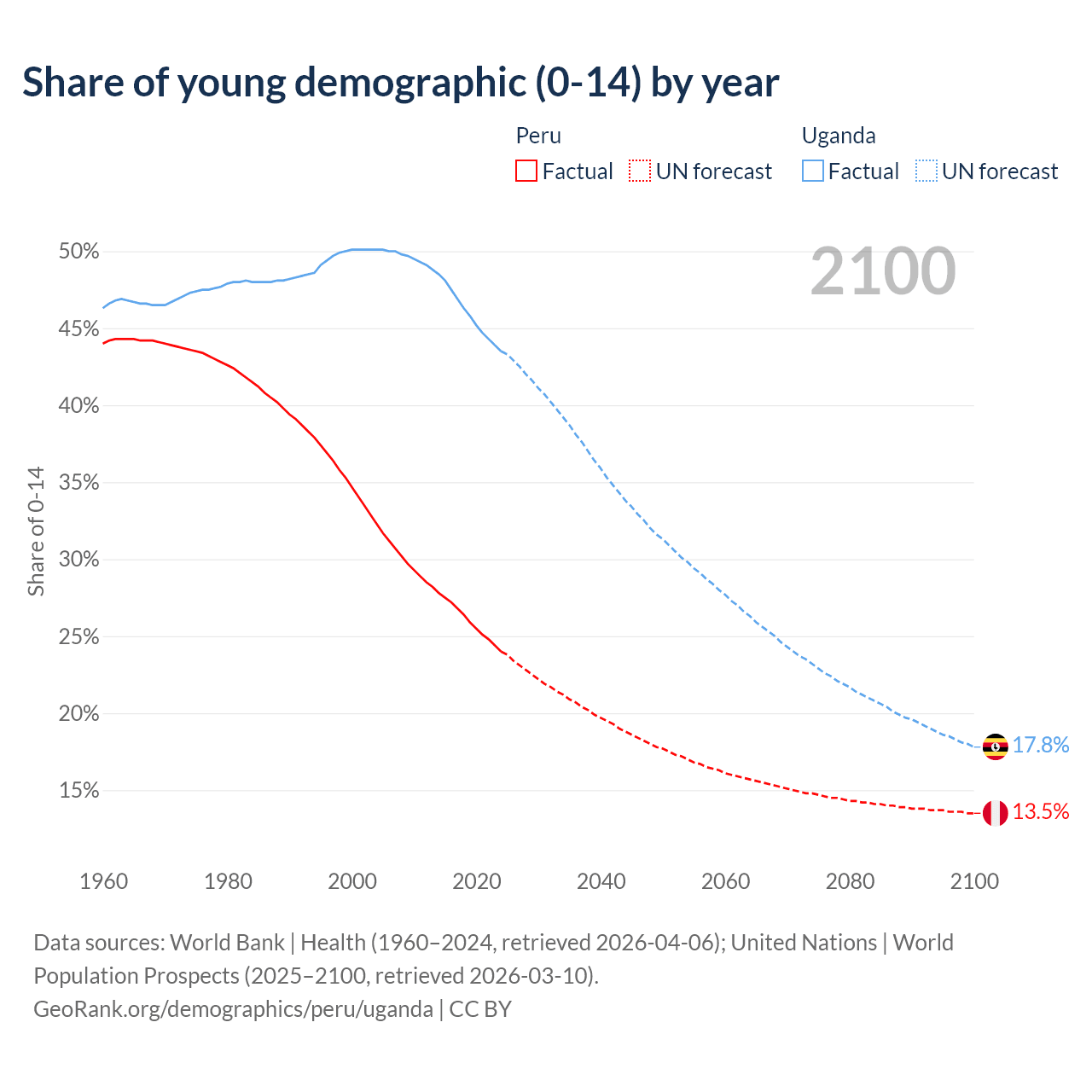 Median age Peru vs Uganda, 1960-2100