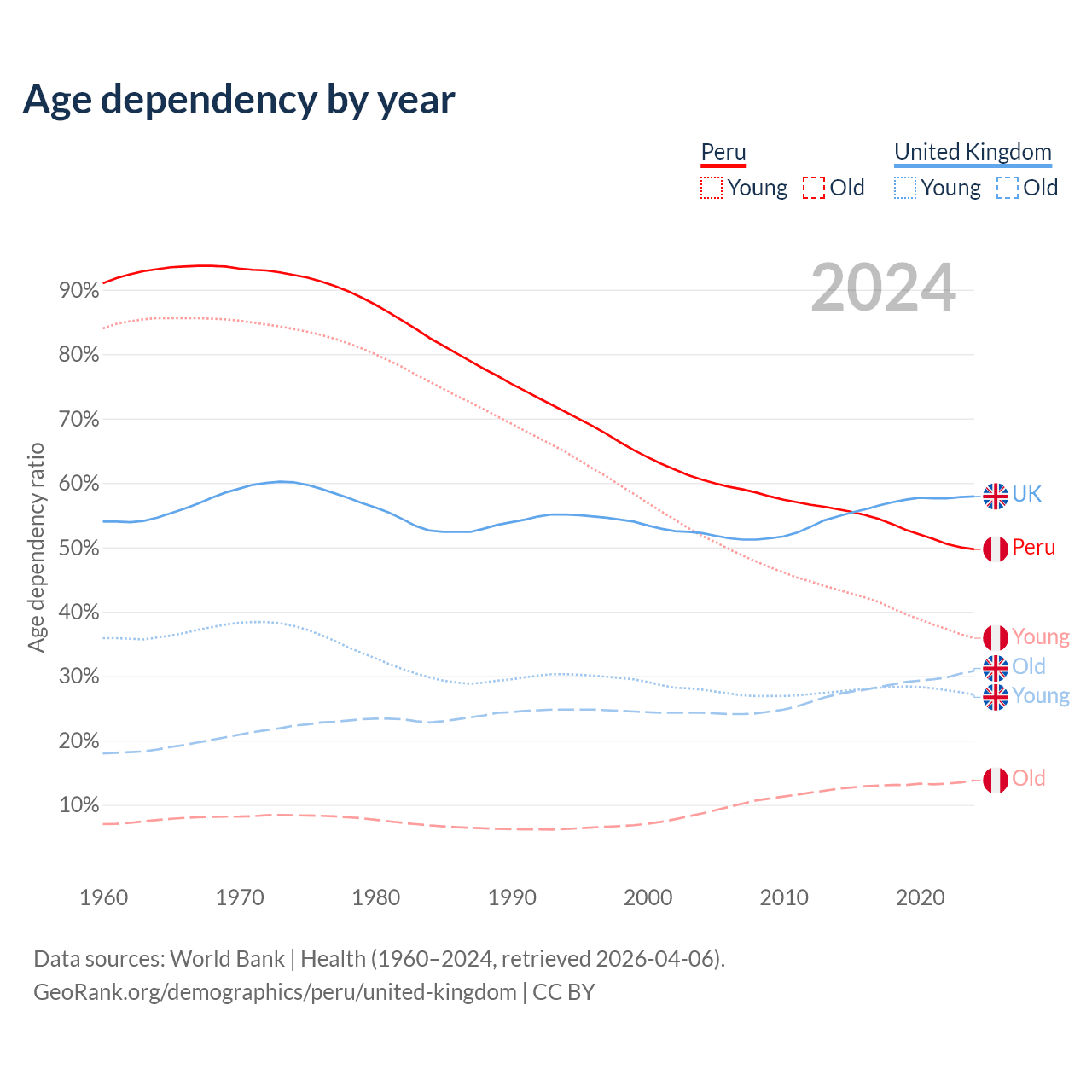 - Peru is ranked 97/196 by median age (oldest to youngest) vs 41/196 for the United Kingdom.