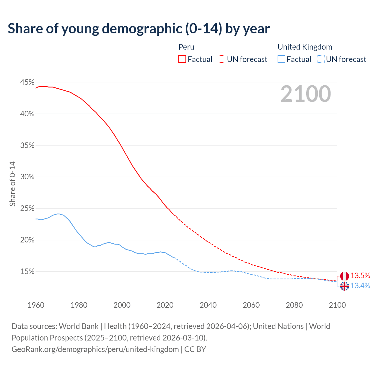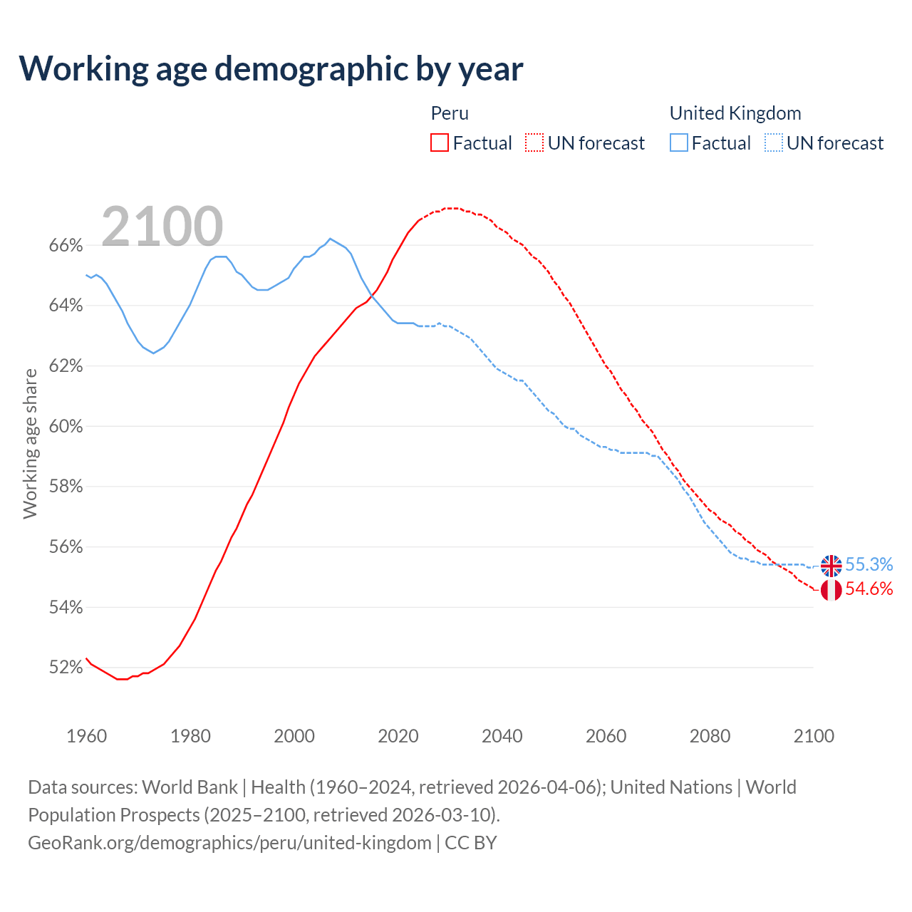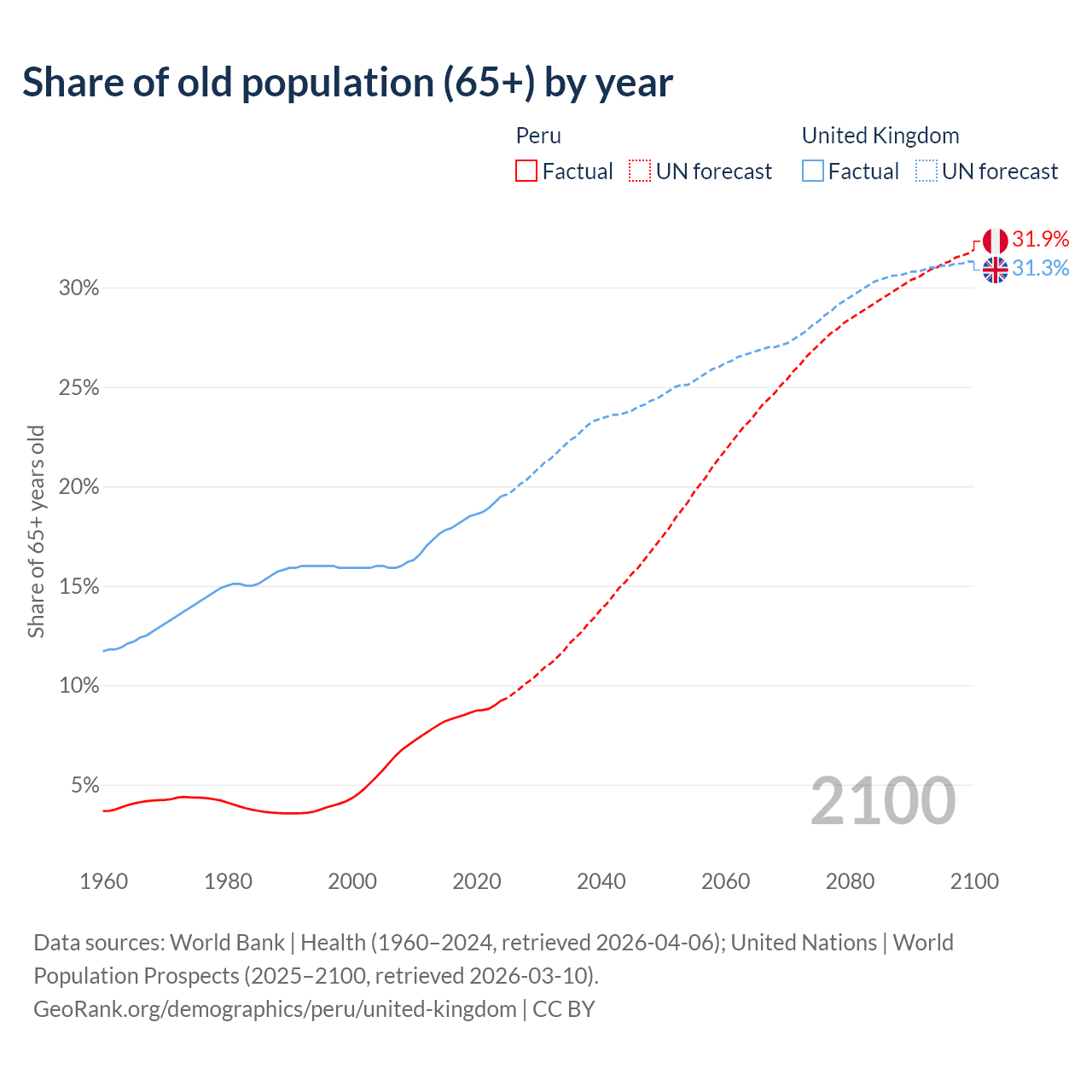 Median age Peru vs United Kingdom, 1960-2100