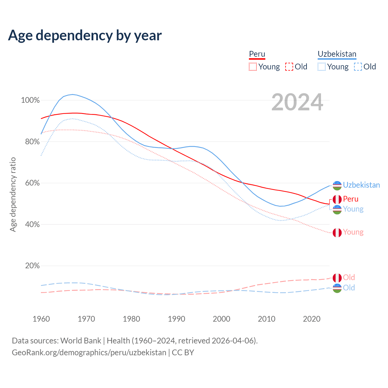 Data sources: World Bank | Health (1960–2024, retrieved 2026-04-06); U.S. Census Bureau (1960–2024, retrieved 2026-02-08).