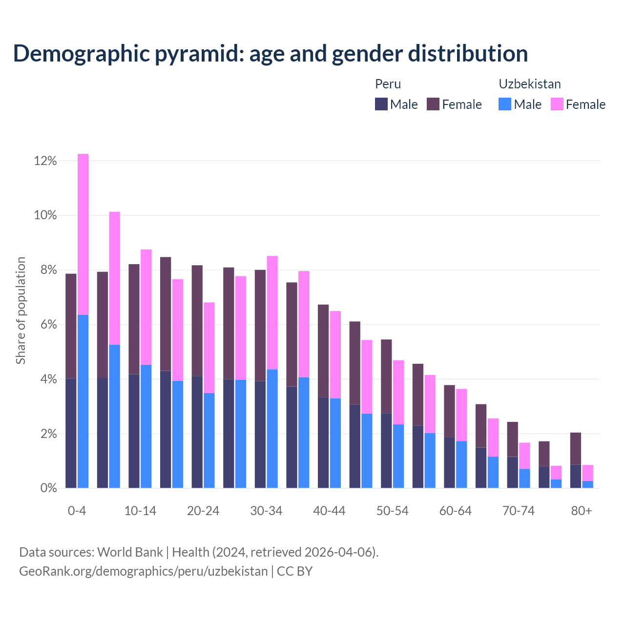 - Peru is ranked 97/196 by median age (oldest to youngest) vs 116/196 for Uzbekistan.