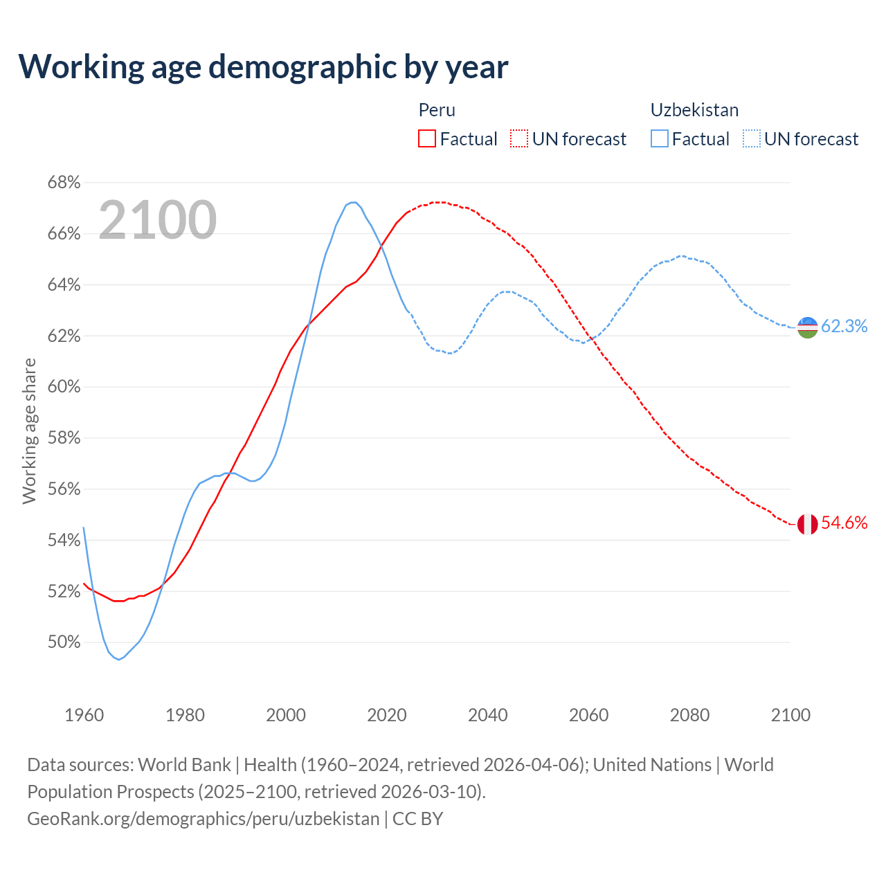 Median age Peru vs Uzbekistan, 1960-2100