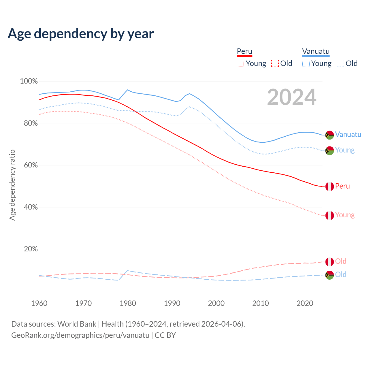 - Peru is ranked 97/196 by median age (oldest to youngest) vs 156/196 for Vanuatu.