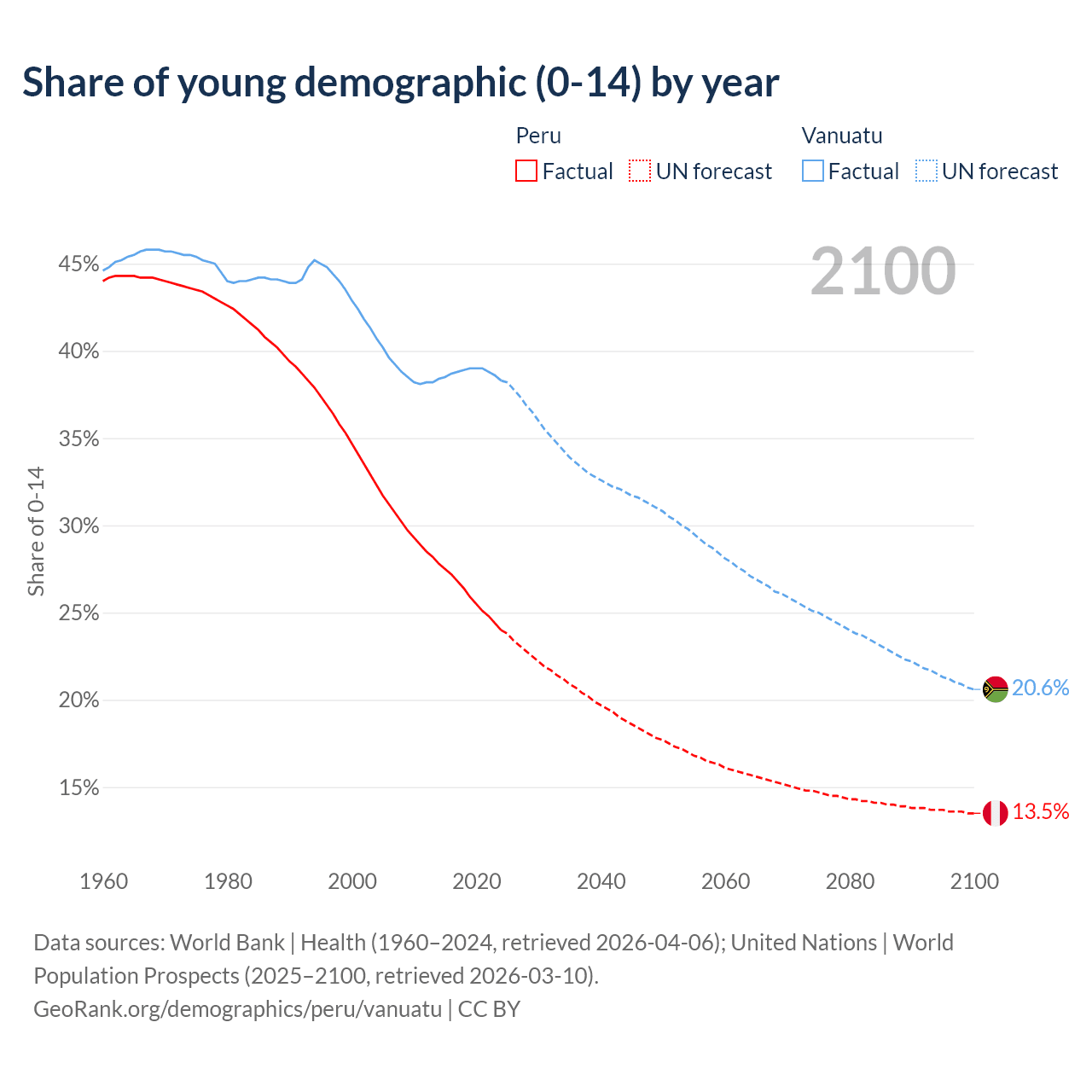 - The share of young demographic (0-15 years old) in Peru is 24% vs 38.3% in Vanuatu.