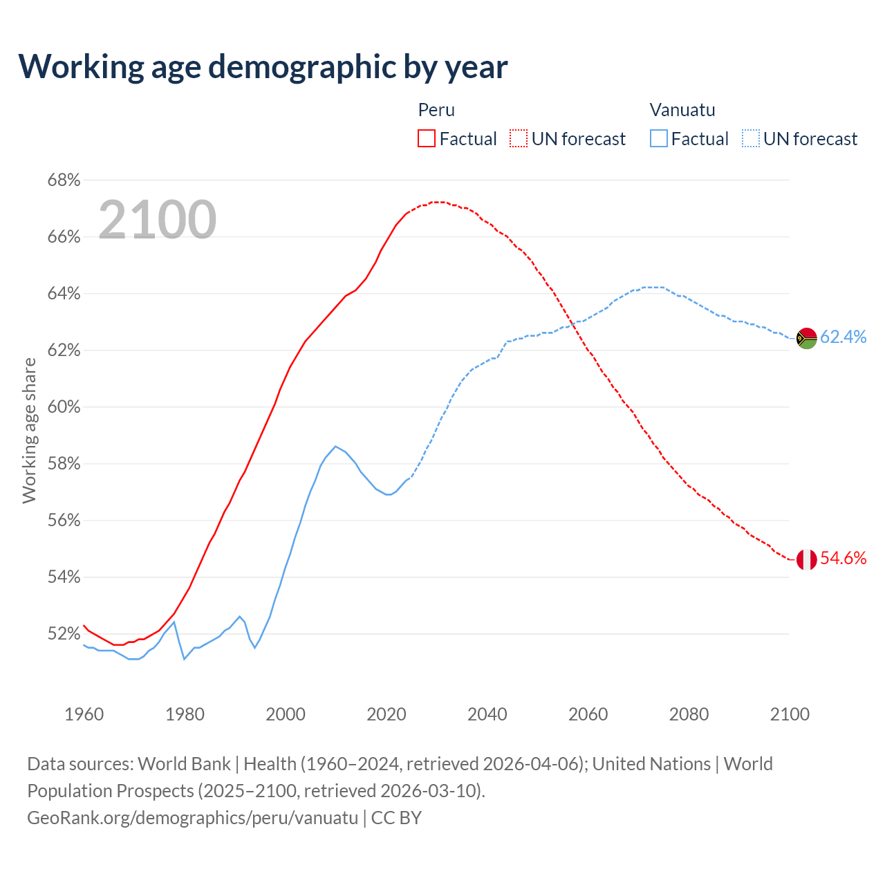 - Peru has 23.4M working age adults (aged 15-64) vs 198K in Vanuatu.