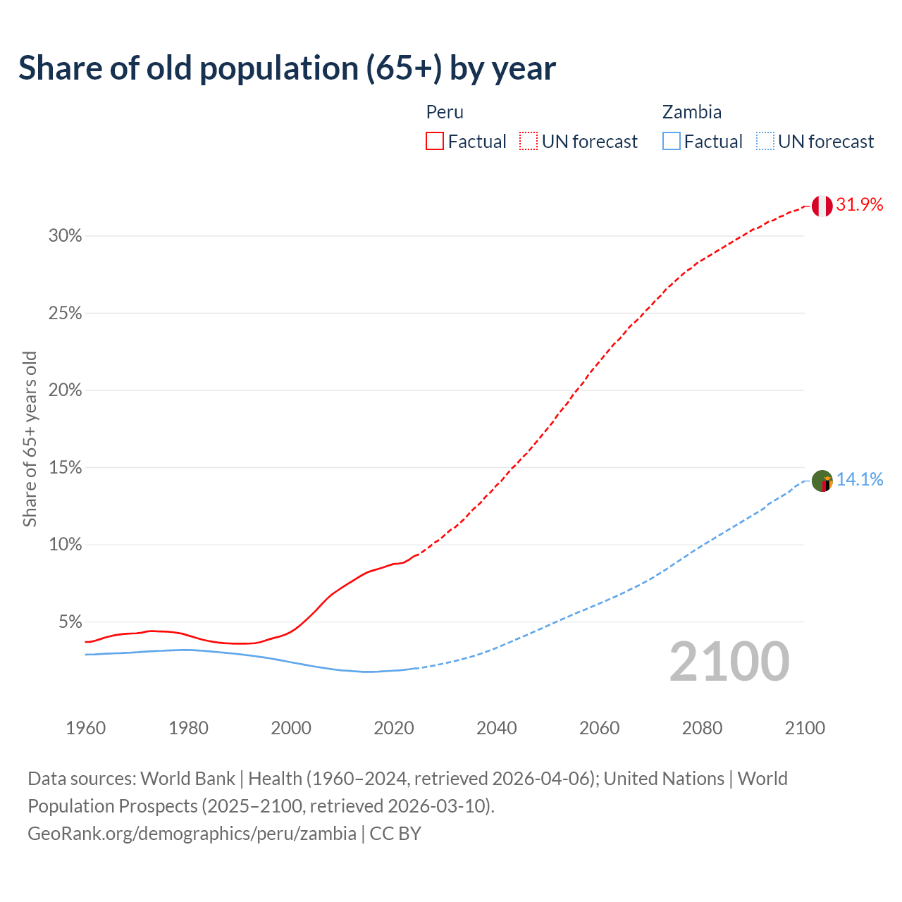 The share of older people aged 65 and over is 9.23% in Peru and 1.95% in Zambia. Life expectancy in Peru compared to Zambia .