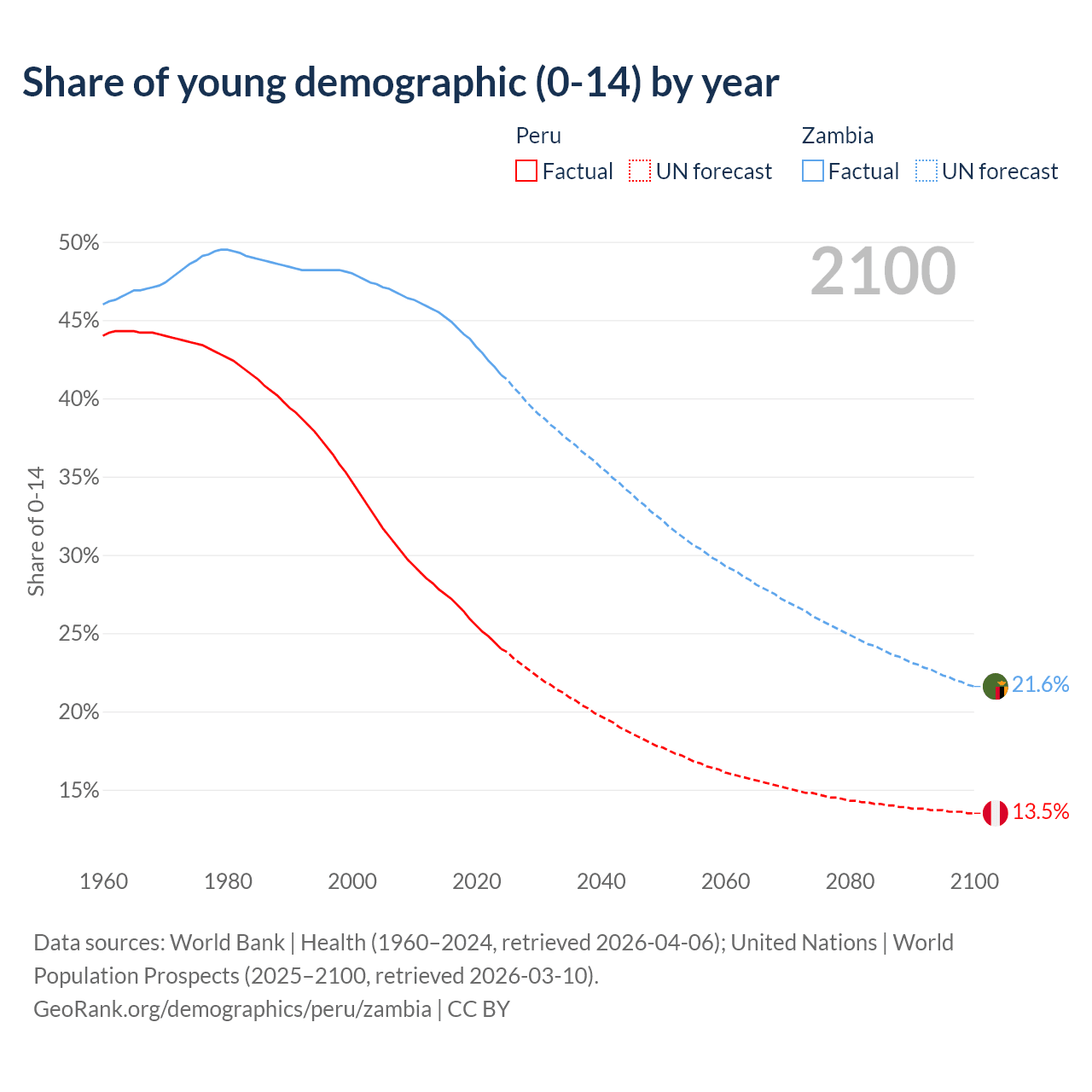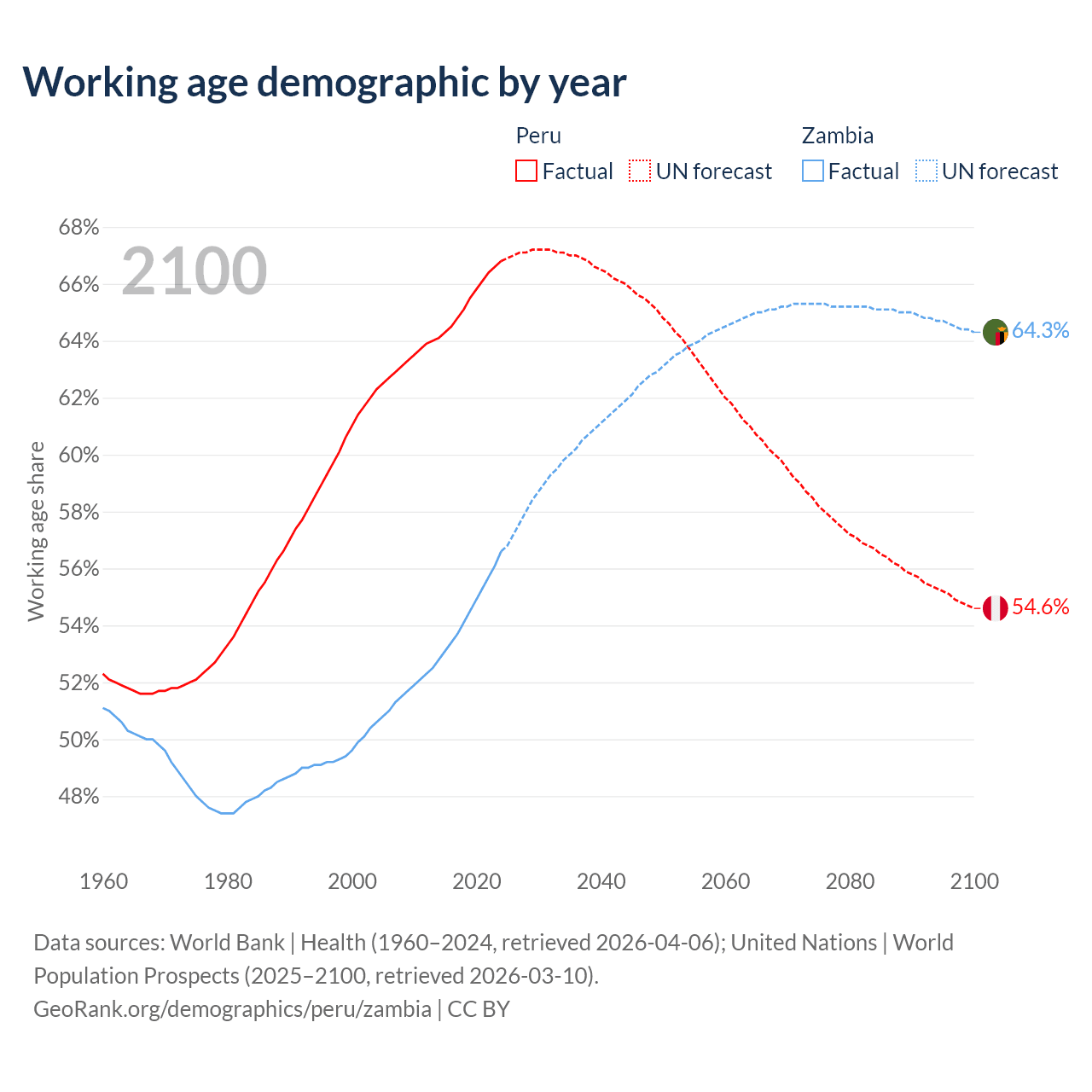 Median age Peru vs Zambia, 1960-2100