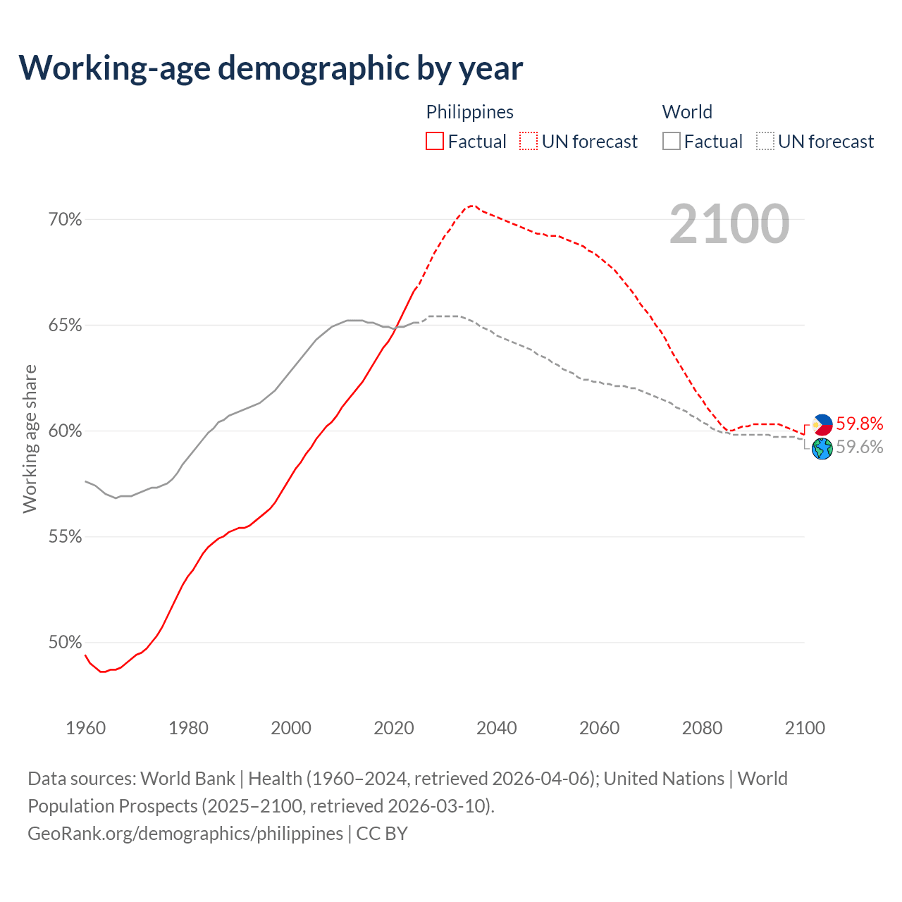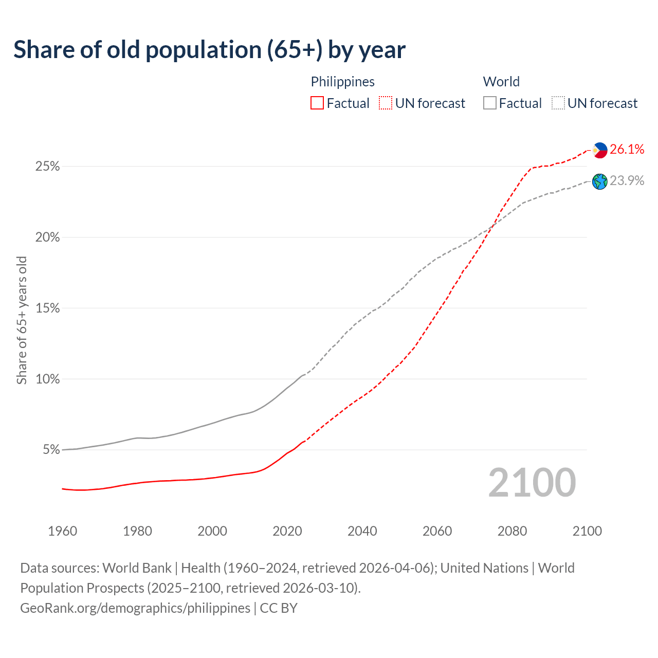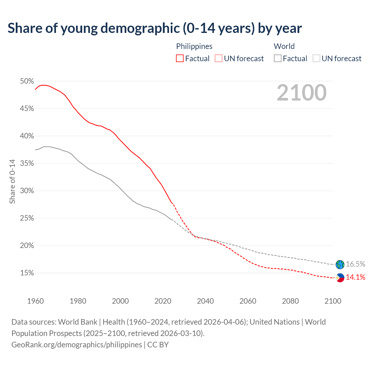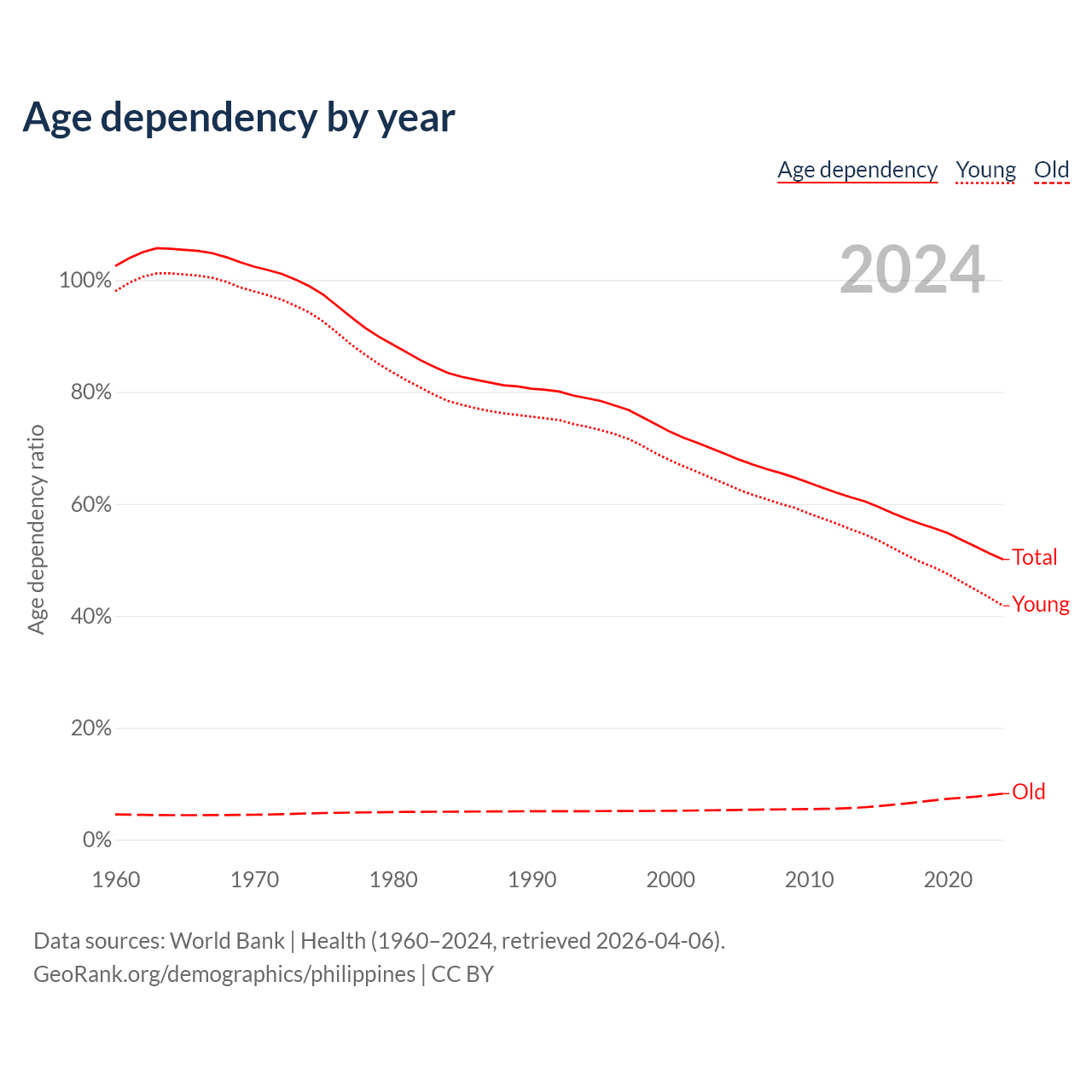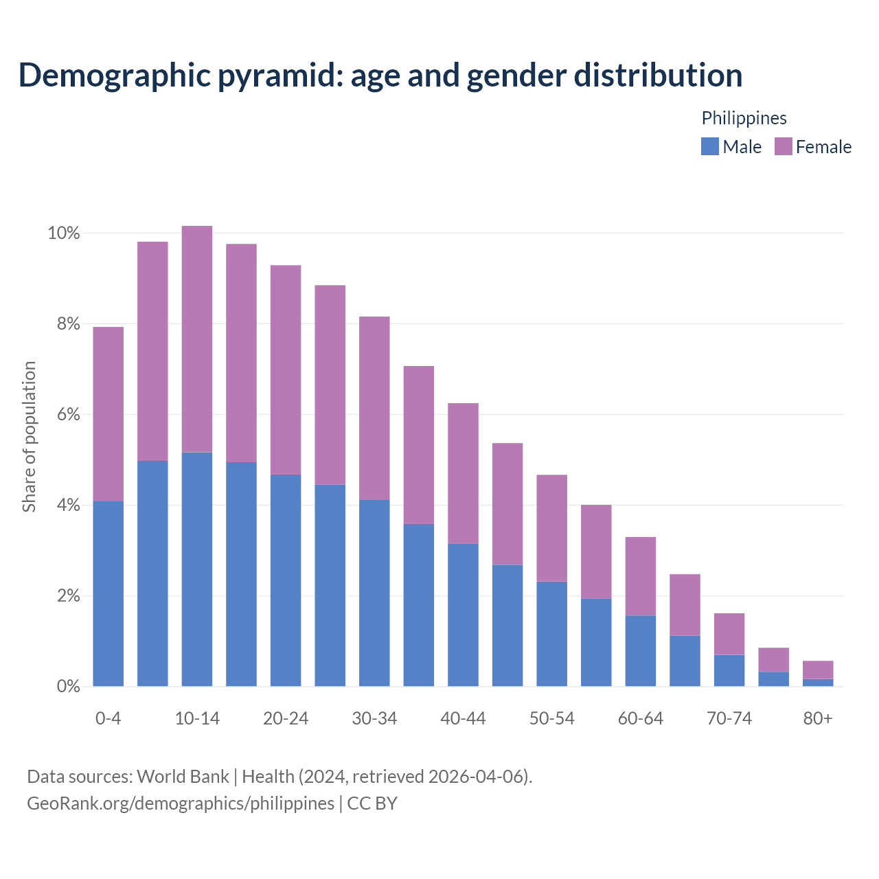 With a population of 116M people, the Philippines has a median age of 26.8 years which makes it the 123/196 oldest country. 27.9% of the demographic are children 0-14 years old, 66.6% are working-age people aged 15-64, and 5.49% are older population aged 65+ years.