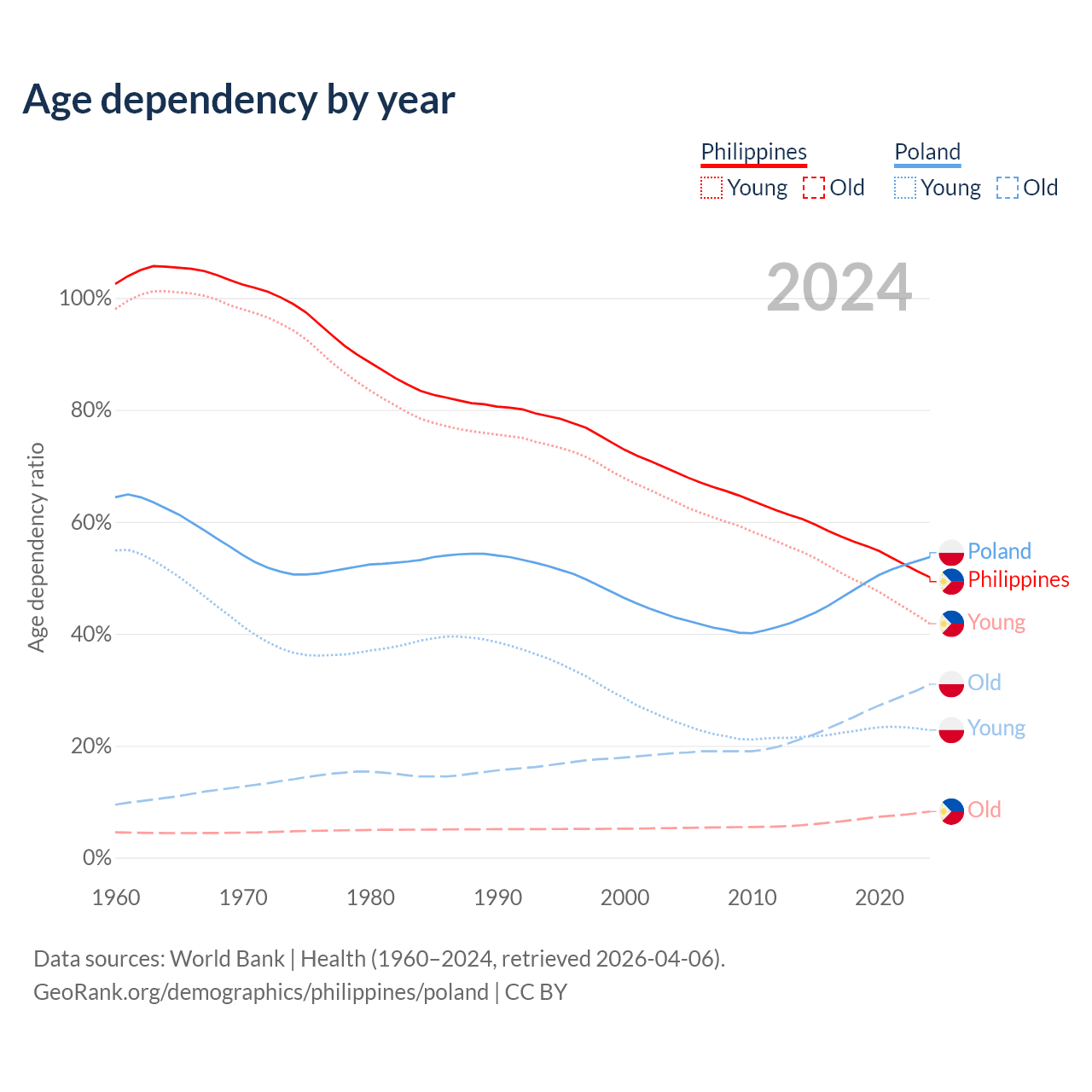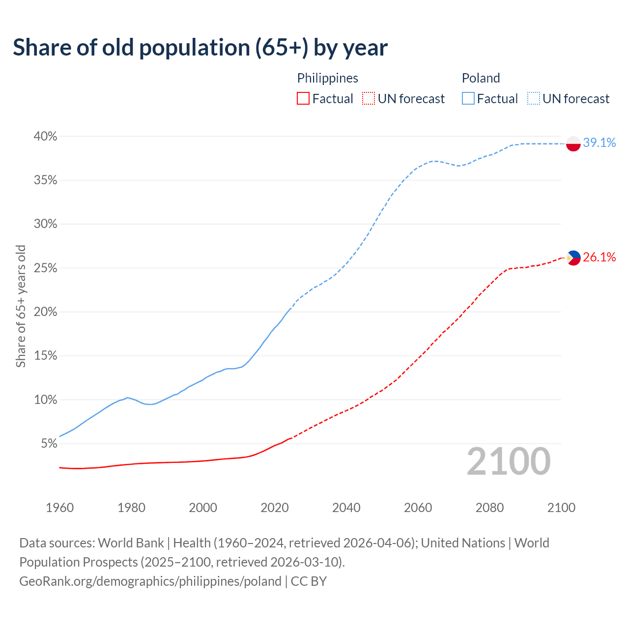 - The share of old-age demographic (65+) in the Philippines is 5.49% vs 20.1% in Poland.