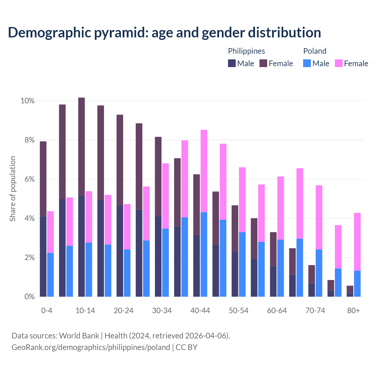 - The median age in the Philippines is 26.8 years compared to 42.9 years in Poland.