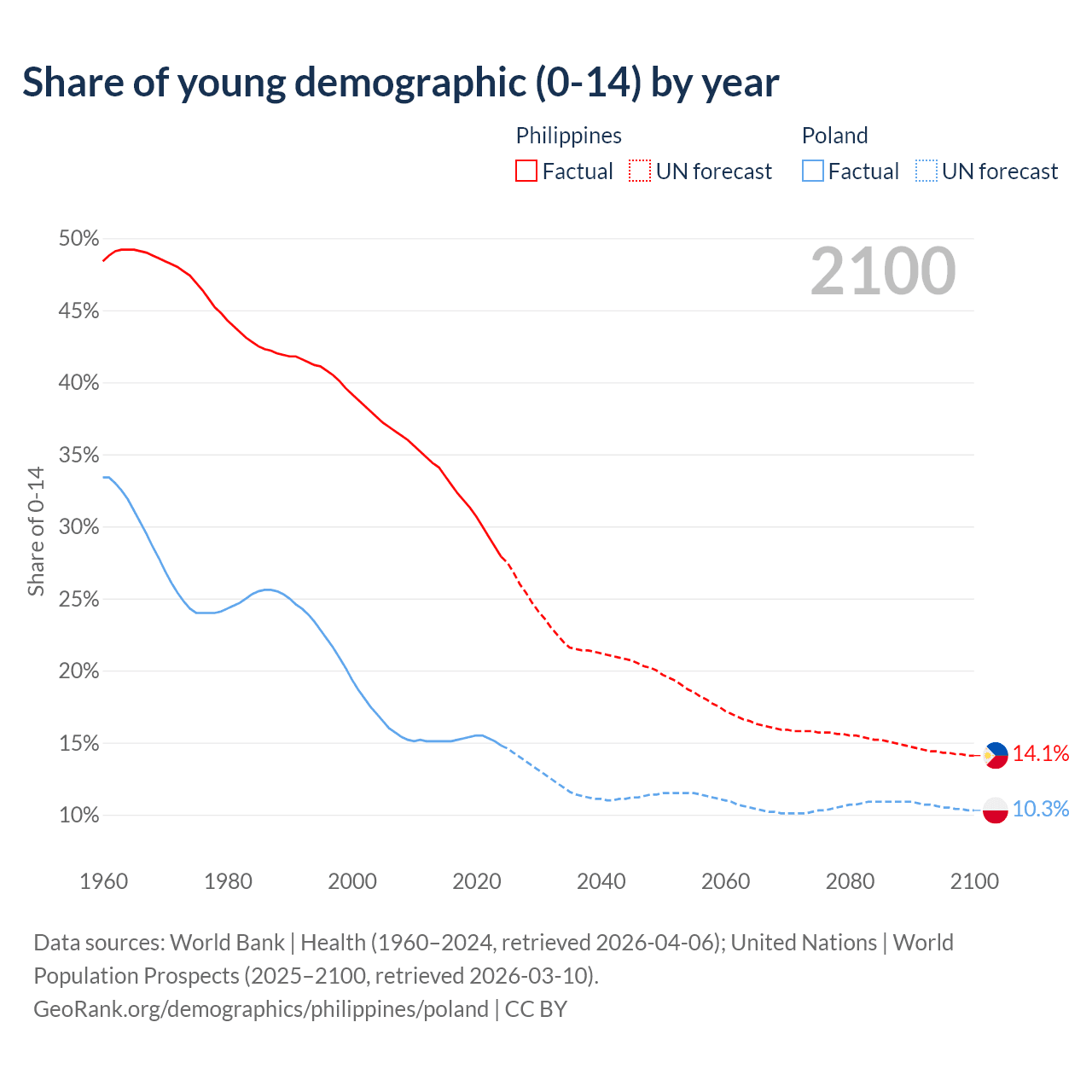 - The share of young demographic (0-15 years old) in the Philippines is 27.9% vs 14.8% in Poland.