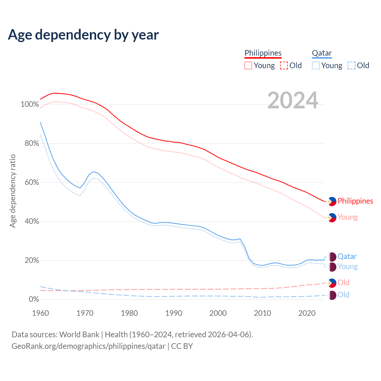 - The share of old-age demographic (65+) in the Philippines is 5.49% vs 1.68% in Qatar.