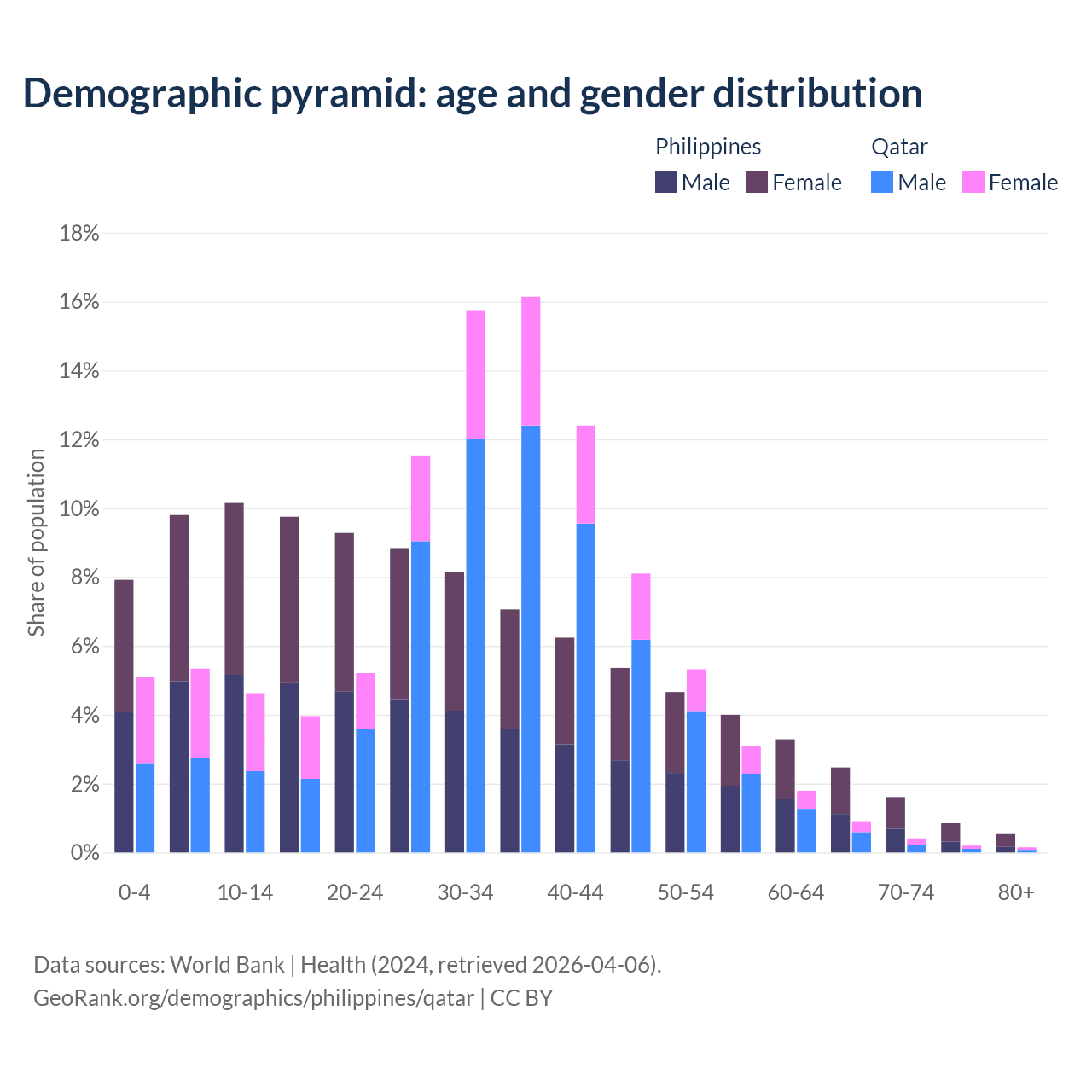 - The median age in the Philippines is 26.8 years compared to 34.5 years in Qatar.