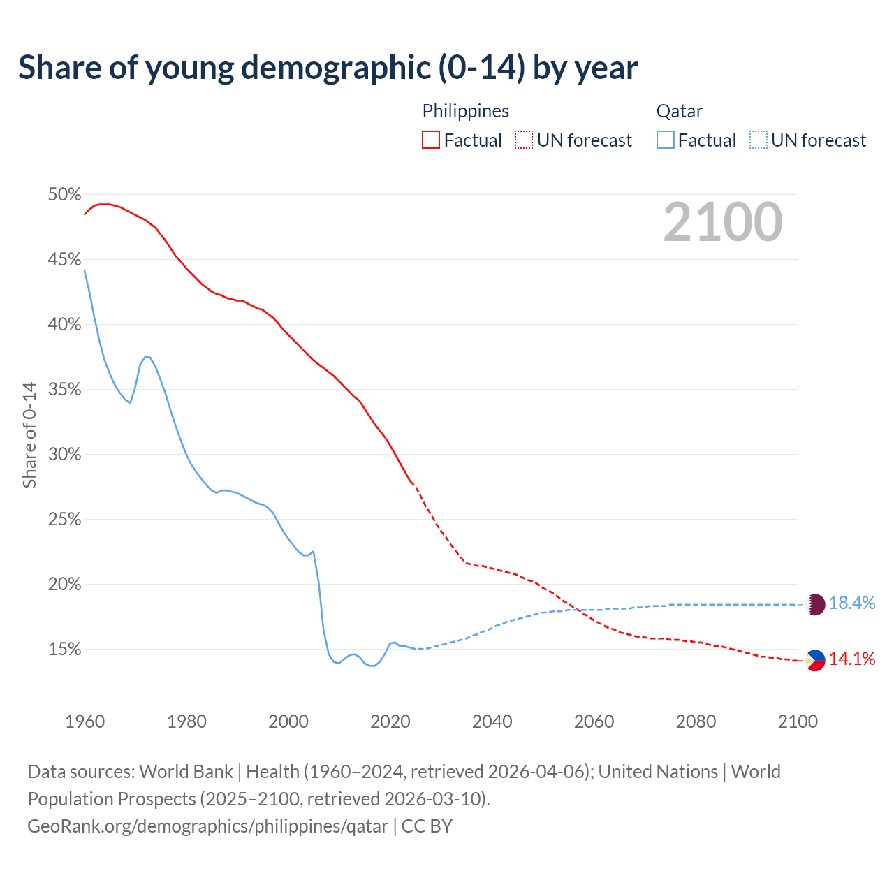 - The share of young demographic (0-15 years old) in the Philippines is 27.9% vs 15.1% in Qatar.