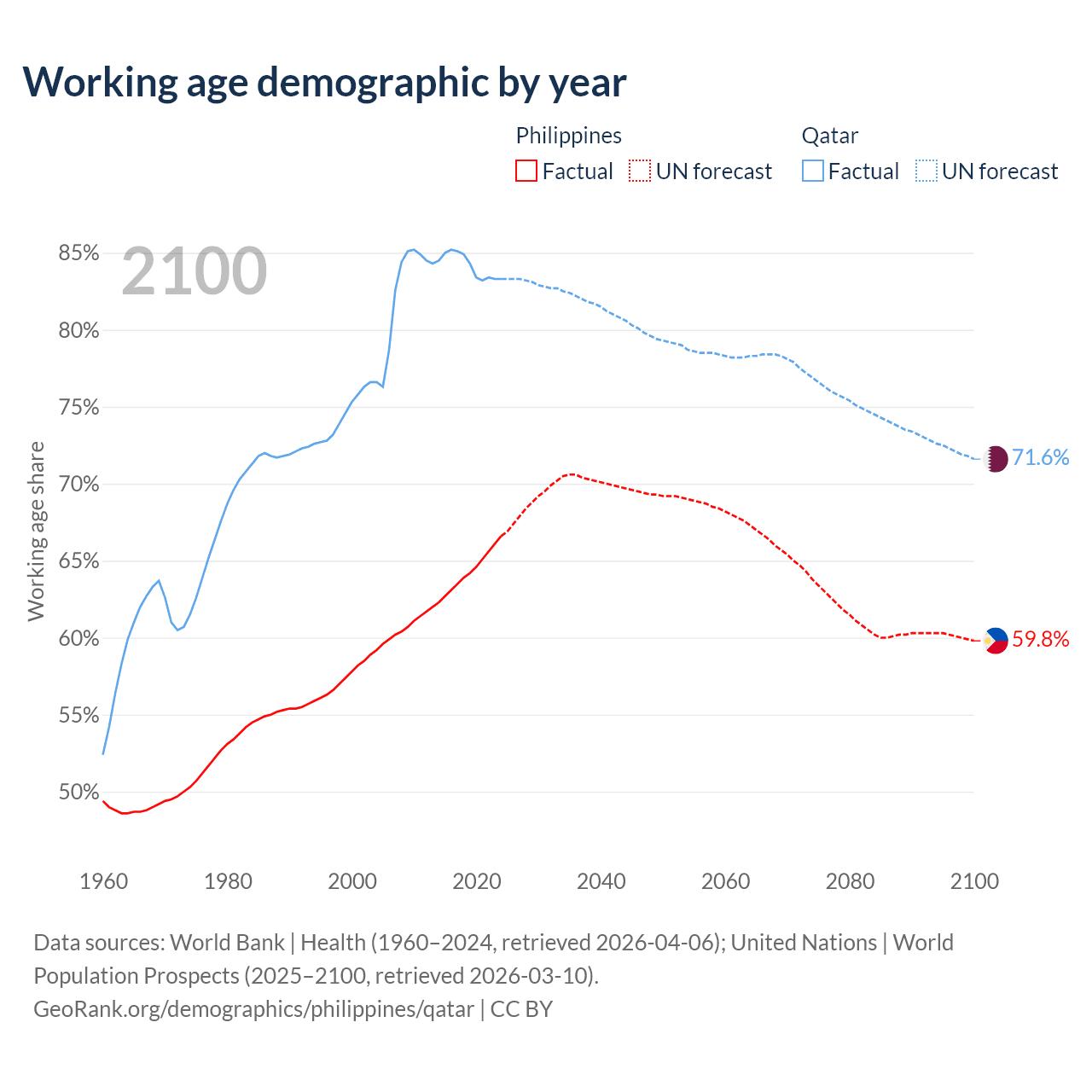 Median age Philippines vs Qatar, 1960-2100