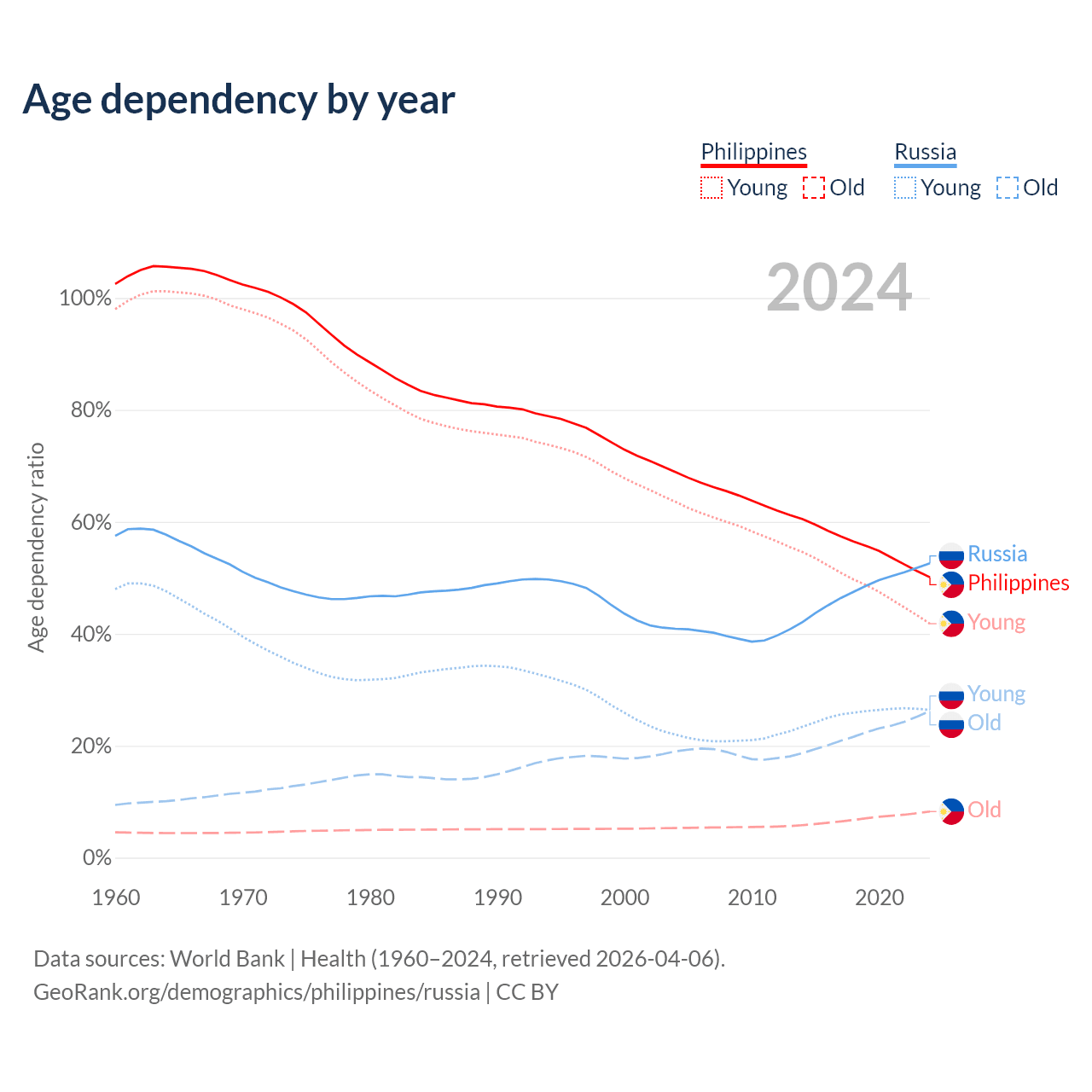 Data sources: World Bank | Health (1960–2024, retrieved 2026-04-06); U.S. Census Bureau (1960–2024, retrieved 2026-02-08).