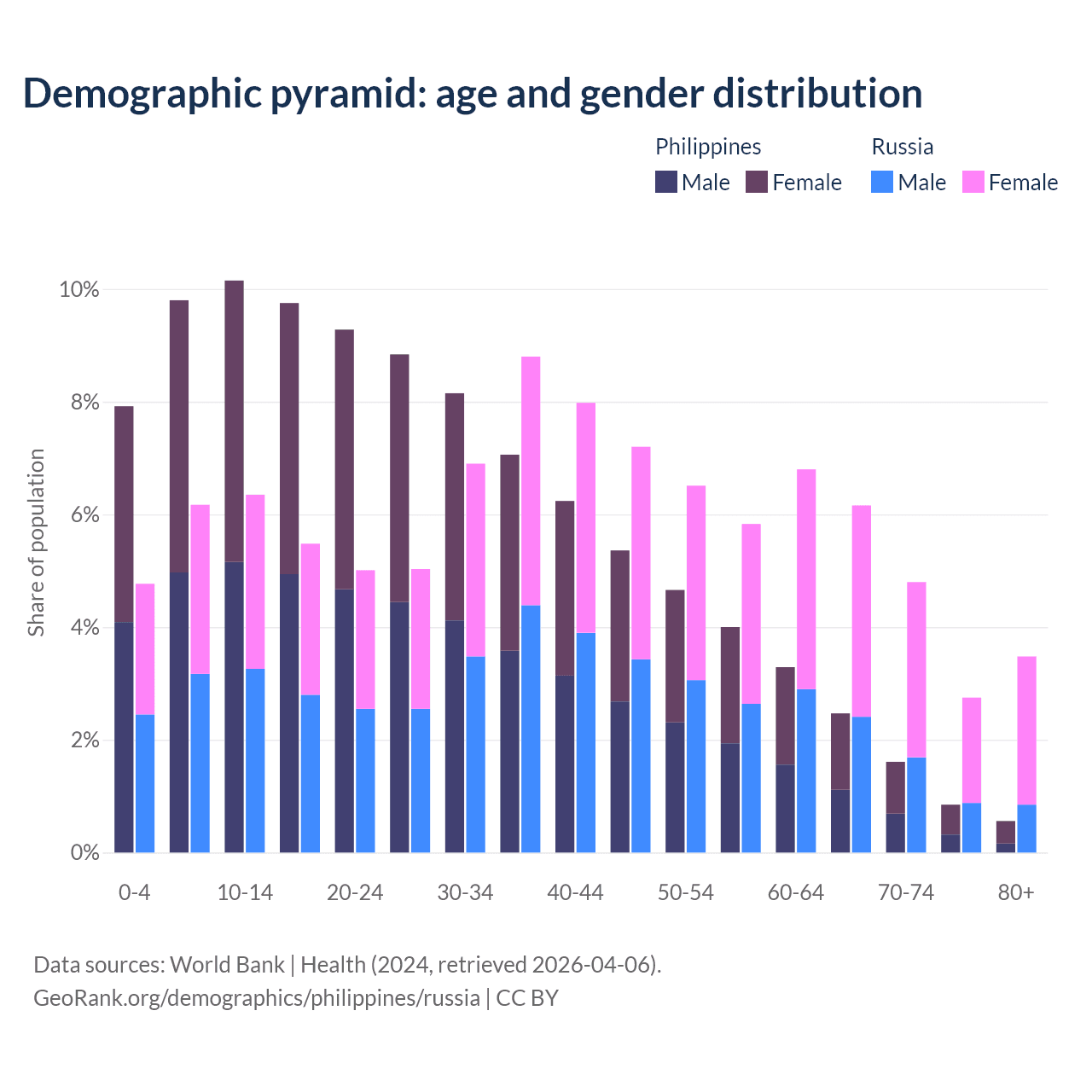 - The share of old-age demographic (65+) in the Philippines is 5.49% vs 17.2% in Russia.